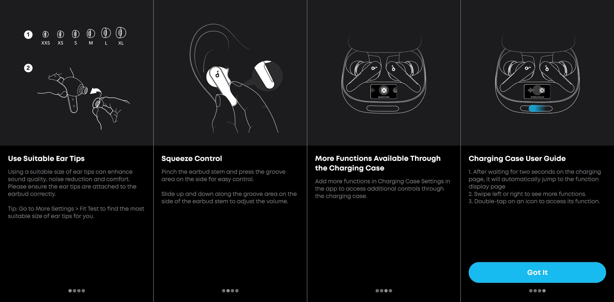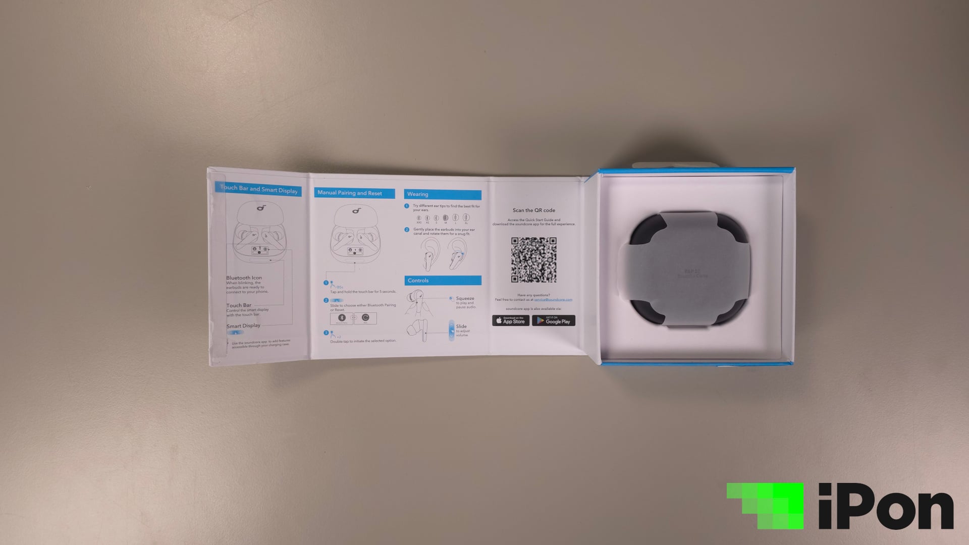 A fülhallgató doboza ráadásul mágneses fedéllel zárul, a belső felét pedig ki is használták egy tömör, de annál hasznosabb beüzemelési és kezelési útmutató prezentálásához és a mobilos apphoz vezető QR-kód feltüntetéséhez.
