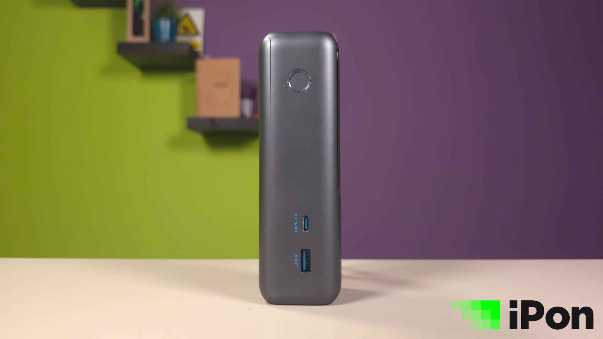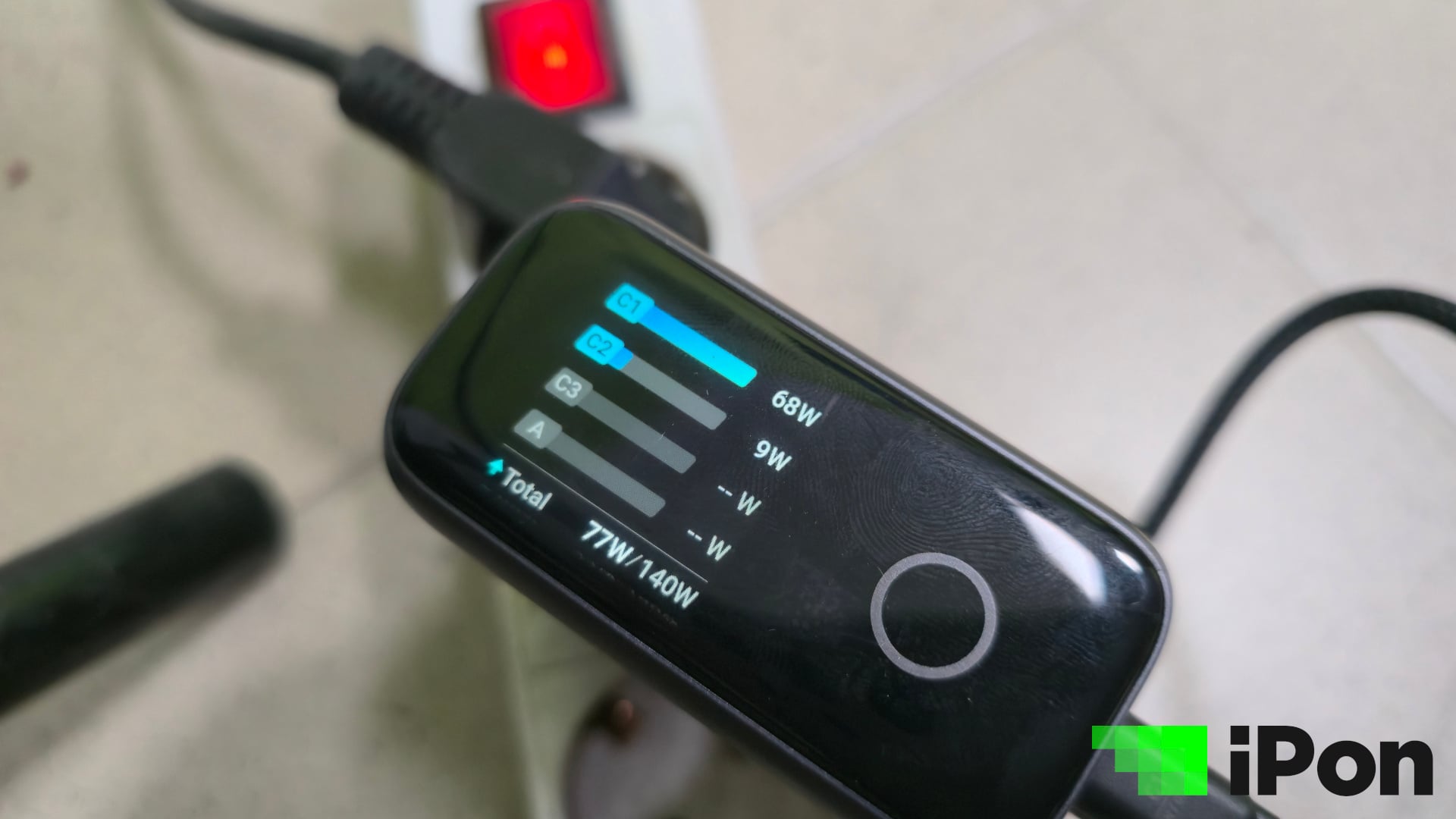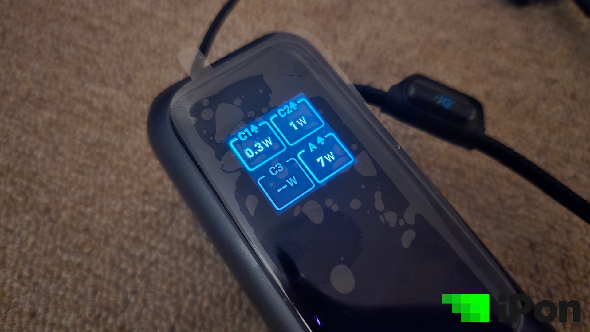 Egy egyszerű gomb, amivel a meglepően látványos kis kijelzőn navigálhatunk a beépített funkciók között. Alapállapot szerint a töltöttségi szintet és az aktuális töltés állapotát mutatja, hogy mennyi az összesen leadott teljesítmény. Tovább navigálva, kimenetekre leosztva is megmutatja nekünk, portonként és természetesen wattban megadva. A felső a C1, az akasztófül a C2, az oldalsó C-s port a C3, illetve az USB-A egyszerűen A-ként szerepel.