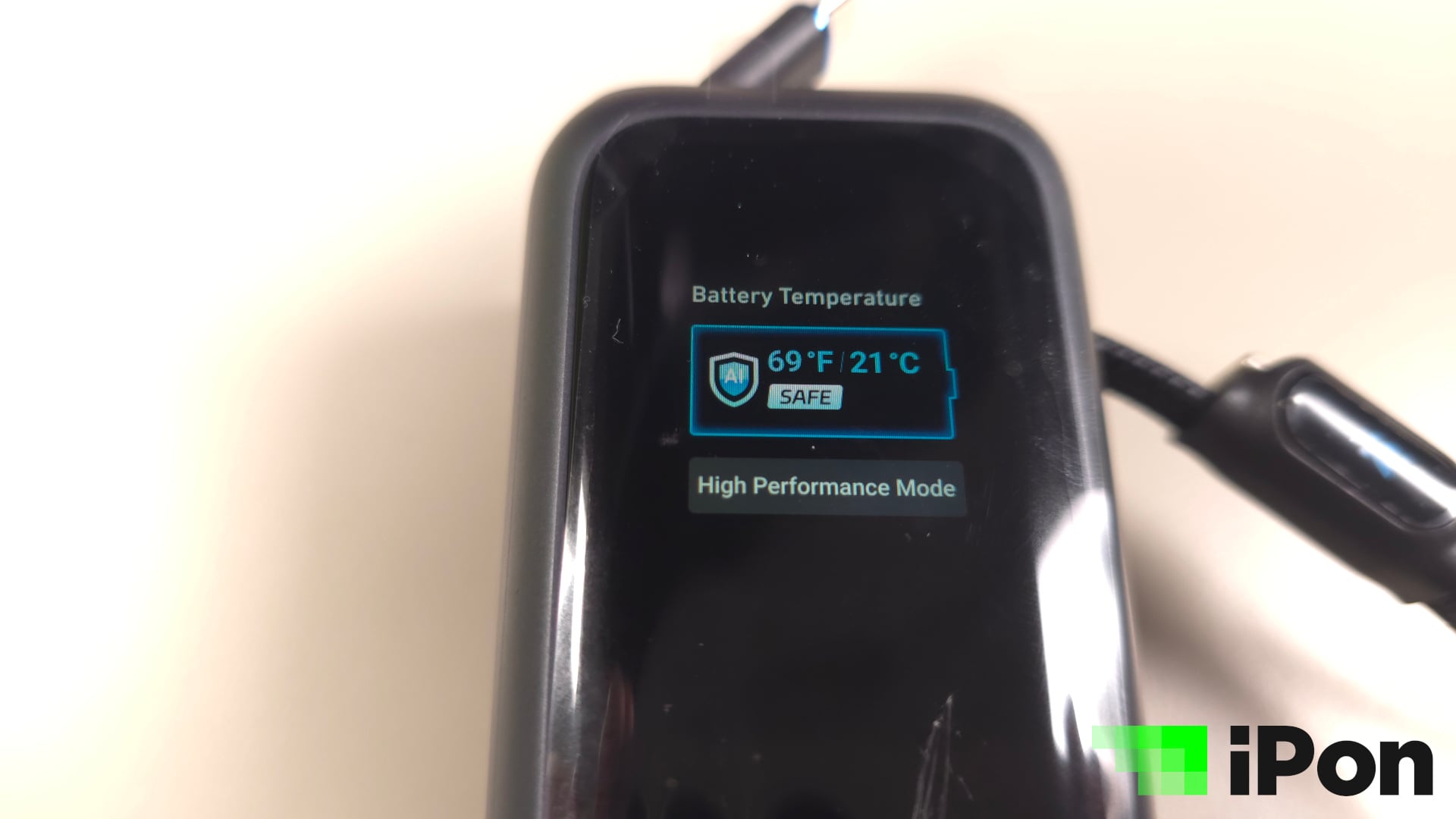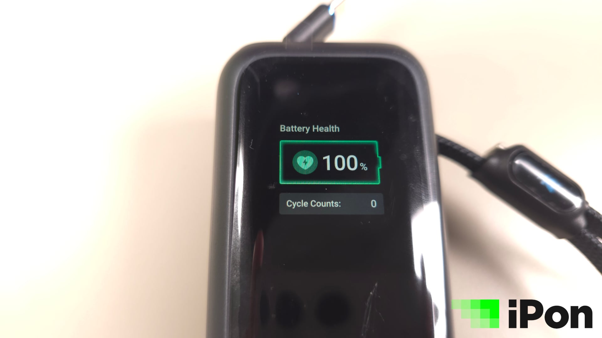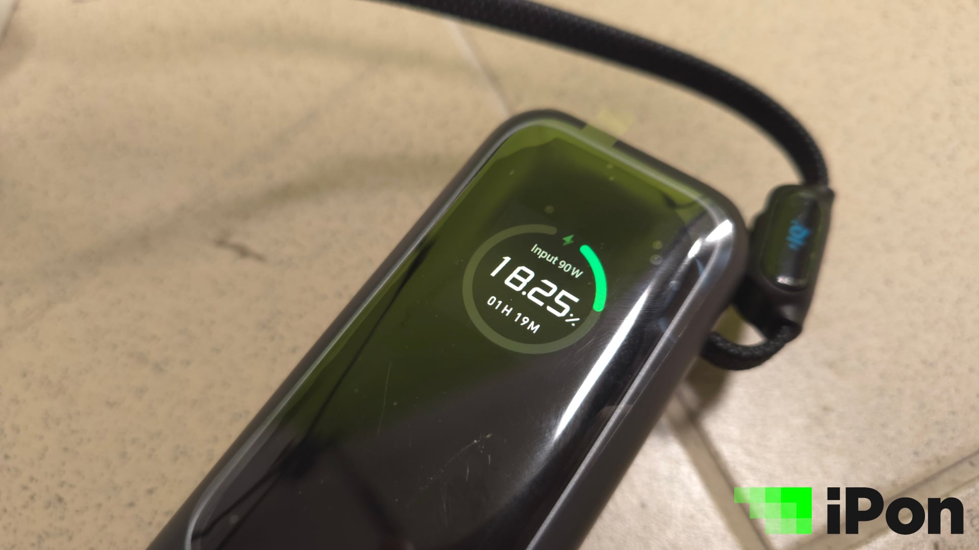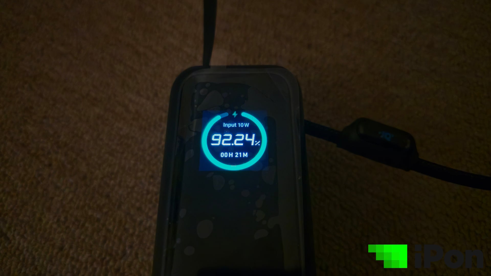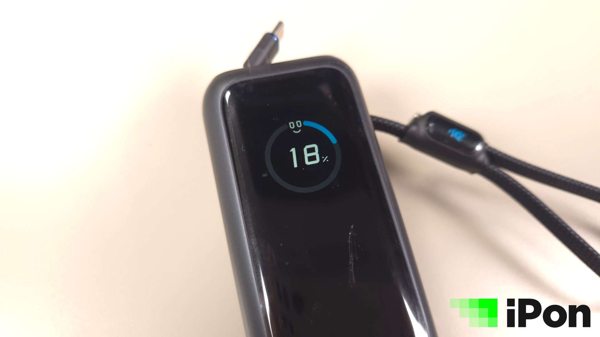 Még azt is megkülönböztethetjük pusztán a színes kijelzőnek köszönhetően, hogy éppen a powerbank tölt valamit, vagy a powerbank az, ami töltést vesz fel. Utóbbi esetlében a töltést jelző kör, illetve csík kékből zöldre vált, de azt is kiírja, hogy nagyjából mennyi idő kell a teljes feltöltésig, természetesen wattban megadva.