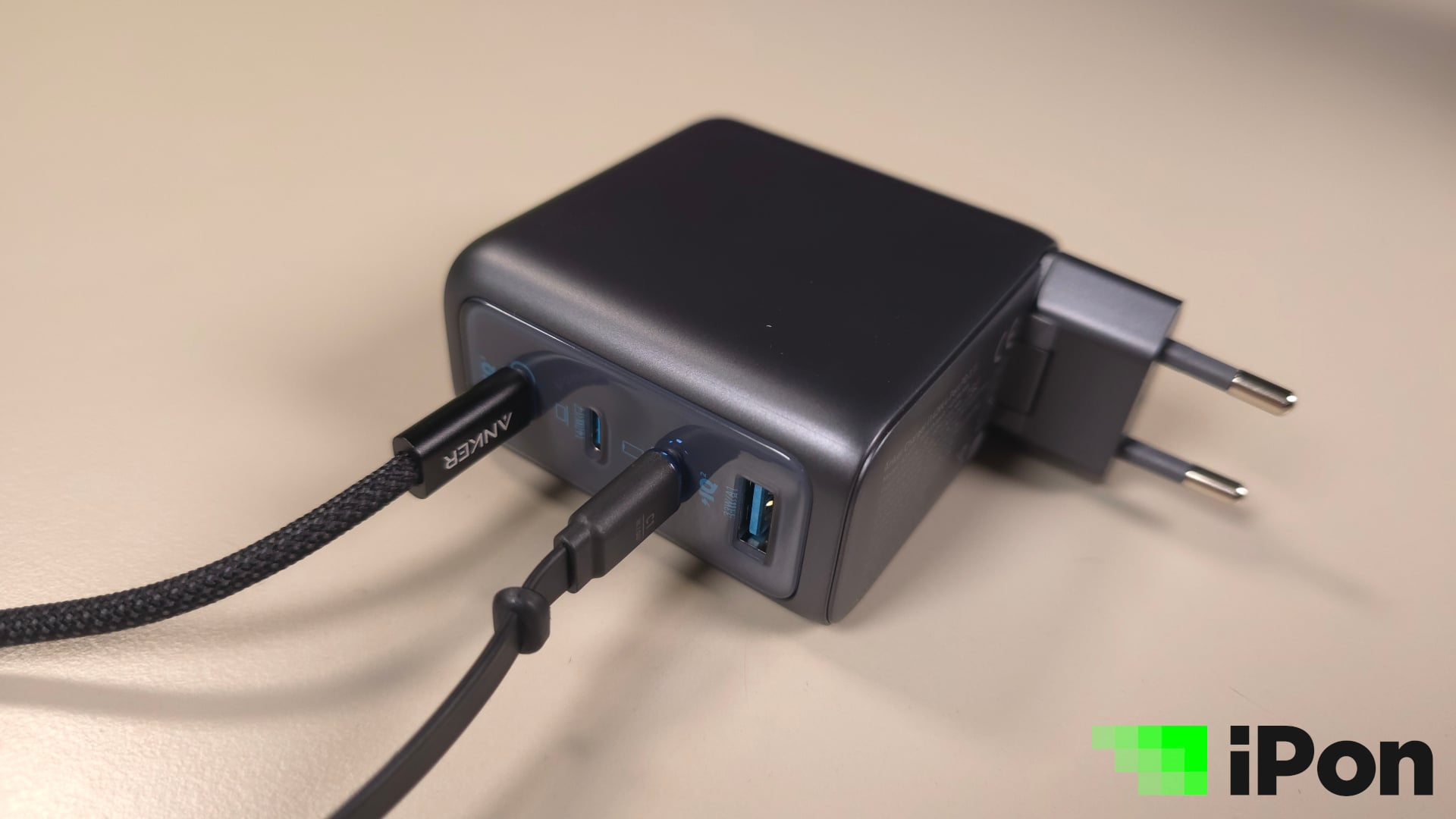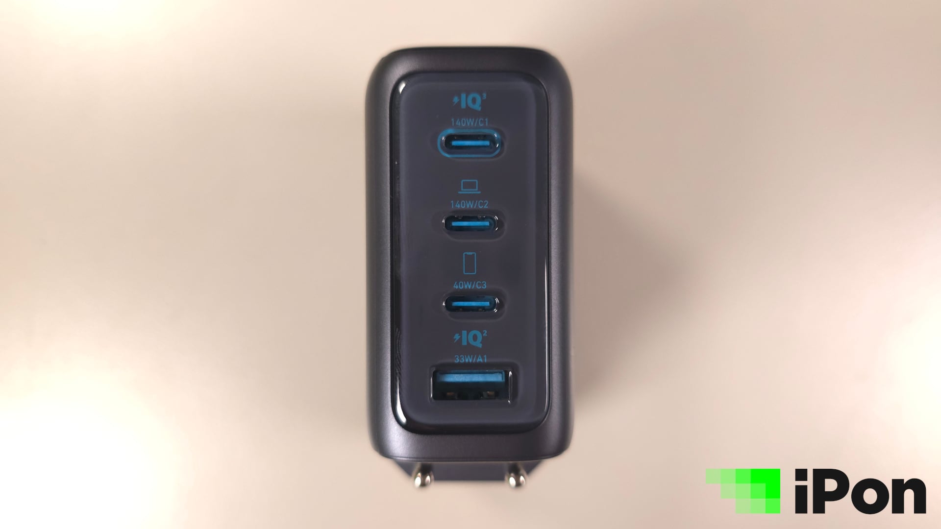 Konkrétan két ilyen USB-C csatlakozója van, egy harmadik, amivel 40 wattig nyújtózhatunk, ami elsősorban mobilokhoz ideális, végül egy USB-A port, legfeljebb 33 watt erejéig. Természetesen minél több csatlakozóra kötünk valamit, annál inkább szétoszlik a maximális teljesítmény, de 3 portig a a legfelső Type-C simán képes lesz 65 wattos töltésre és természetesen mind a 4 port használható egyszerre.