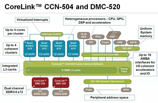 A CoreLink CCN-504 Cache Coherent Network névre keresztelt megoldás akár terabites sávszélességű kapcsolatot is képes biztosítani az egyes processzormagok között. A kapcsolat segítségével maximum 16 darab Cortex-A15-ös sorozatú processzormagot lehet összekapcsolni, de az összeköttetés a jövőben megjelenő, ARMv8-as dizájn köré épülő processzormagok esetében is alkalmazható lesz.