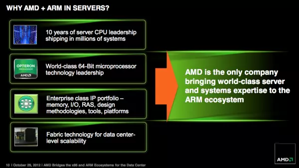Az új, Opteron márkájú processzorok úttörő megoldásoknak számítanak majd, hiszen ezek lesznek az első olyan megoldások, amelyek hidat képeznek az x86-os és a 64-bites ARM architektúra között, így magas szintű flexibilitást, optimális teljesítményt és energiahatékony működést kínálnak majd a szerverpiac szereplői számára. Az újdonságok segítségével az AMD arra az egyre fokozódó trendre kíván reagálni, amelynek értelmében az egyes piaci szereplők az egyre jobb teljesítmény/watt hányadossal rendelkező központi egységeket keresik ahhoz, hogy minél energiahatékonyabb, minél sűrűbb felhő alapú kiszolgáló rendszereket építhessenek. Az AMD a friss lépéssel tehát egy olyan, éppen növekvő szegmensbe, a mikroszerverek piacára szeretne berobbanni, amely a jövőben rendkívüli fontossággal bír majd.