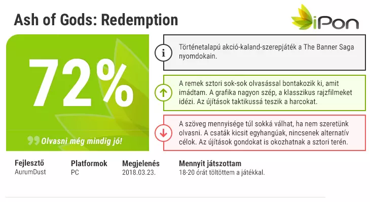 Az Ash of Gods mindenképpen több, mint egy sima klón, melyet a The Banner Saga alapján készítettek. A küzdelmek talán nem olyan összetettek itt, de a saját plusz ötletek, mint a kártyák alkalmazása, vagy a végleges halál fenyegetése, illetve főleg a remek történet elegendő különbséget biztosít. A turmix azonban nem sikerült tökéletesre: a permadeath az izgalmak mellett gondokat is okozhat a sztori terén, ez pedig azért nem szerencsés, mert a történet viszi el a hátán a többi elemet, alapesetben törődünk a karakterekkel, de ha útközben meghalnak, akkor sokszor csak zűrzavar marad a helyükön. A sztorimód ezen segít, itt azonban a csihipuhi kedvelőinek nem terem sok babér, hiszen vajmi kevés kihívás marad. A játék abba a csoportba tartozik, amit inkább interaktív könyvnek, vagy rajzfilmnek lehet felfogni, és ebben nagyon jól teljesít. Ha nem bánjátok, hogy sokat kell olvasni, próbáljátok ki ti is!