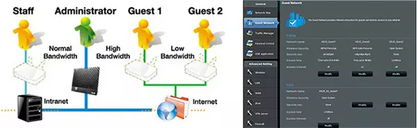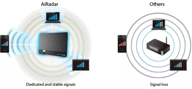 A lehető legkedvezőbb vezeték nélküli adatátviteli sebességről, illetve lefedettségről az ASUS AiRadar technológiája gondoskodik, amely a WiFi kapcsolat biztosításánál figyelembe veszi az eszközök hozzá viszonyított elhelyezkedését is. A vezeték nélküli kapcsolatot a már megszokott adattitkosítási opciókkal védhetjük, de vendég funkció is rendelkezésre áll, amivel ideiglenes internetes és/vagy helyi hálózati hozzáférést biztosíthatunk az egyes WiFi eszközök számára.