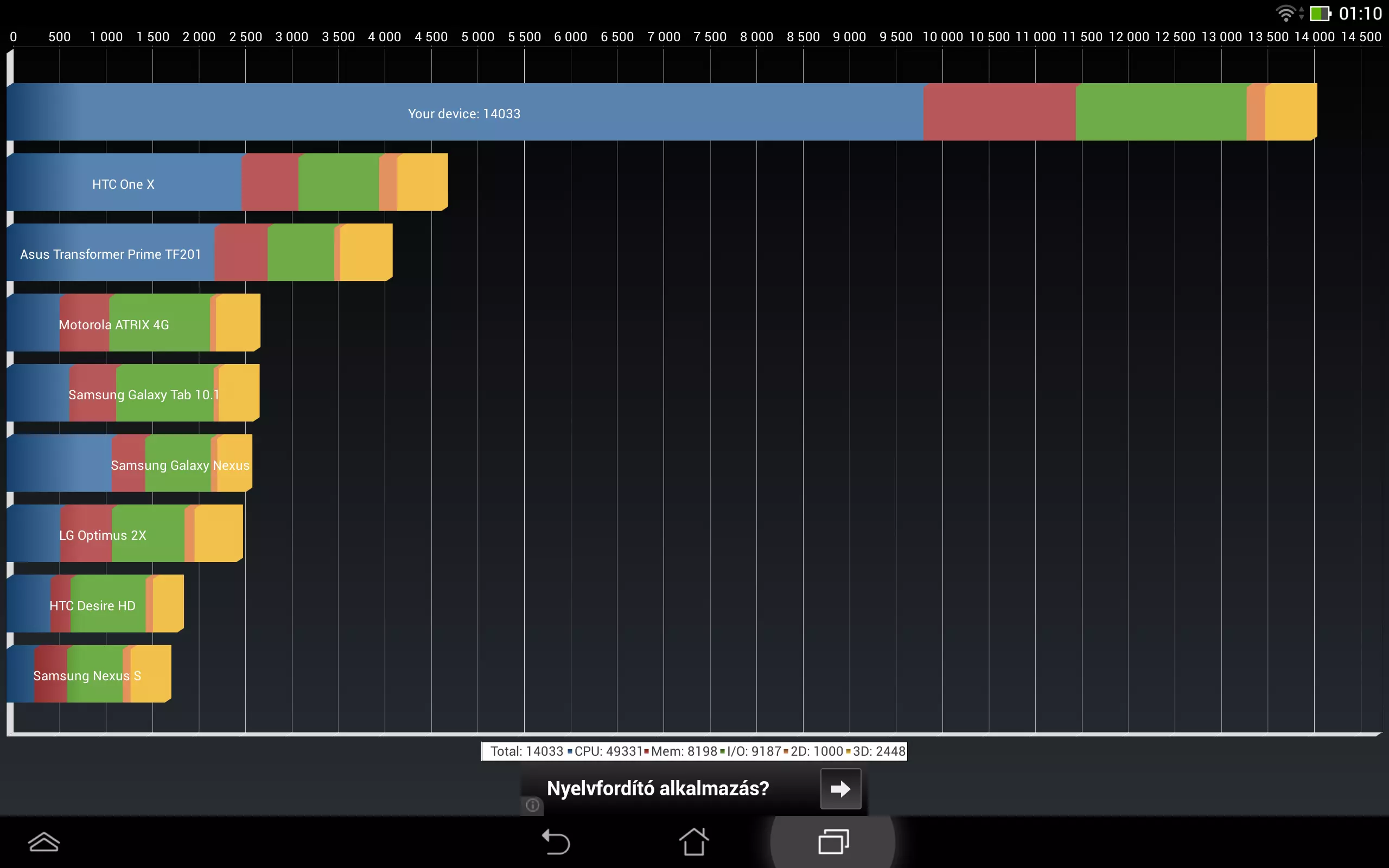Az üzemidő elég impozáns, a YouTube-os mérésre nem volt időnk (nem merült le időben a gép…), de az biztos, hogy a TF701T bírja az egész napos nyüstölést, és mi nem kíméltük. Böngésztünk, játszottunk, benchmarkokat futtattunk, screenshotokat készítgettünk, de nem akarta félúton feladni. Átlagos használat mellett biztos, hogy nem kell majd naponta töltőre dugni, a 10 órát könnyen hozza (dokkoló nélkül).
