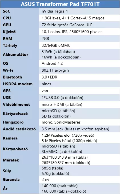 A felhasznált SoC mellett még érdemes kiemelni a 2560*1600-as felbontású IPS panelt és a Transformerek legnagyobb különlegességét, a billentyűzetes dokkolót, amiben egy második akkumulátor is található. Ezzel kitolható a TF701T üzemideje annyira, hogy szinte bármilyen terhelés mellett kibírjon egy napot velünk. A belső tárhely SD vagy microSD kártyával most is tovább bővíthető, de érdekes módon a táblának nincs rendes USB portja, az ASUS egy saját csatlakozót használt a töltéshez és a dokkoló csatlakoztatásához. A dokkolón azért szerencsére van egy USB 3.0-s port, ami ráadásul teljes méretű, így mindenféle átalakító nélkül rádughatjuk pendrivejainkat a gépre. A kamerák átlagosak, a hangszóró pedig felemásra sikerült. Különös, hogy csak egy van belőle, viszont az legalább SonicMasteres, és ez az ASUS-nál többet szokott jelenteni egy üres marketing elnevezésnél, később visszatérünk rá. A WiFi nem ac-s, de támogatja a MiraCastot és van egy micro-HDMI kimenetünk is. Persze a specifikáció messze nem mond el mindent a gépről, úgyhogy a következő pár oldalon megpróbáljuk bemutatni, hogy mit is kapunk a pénzünkért, ha a legújabb Transformer mellett tesszük le a voksunkat.