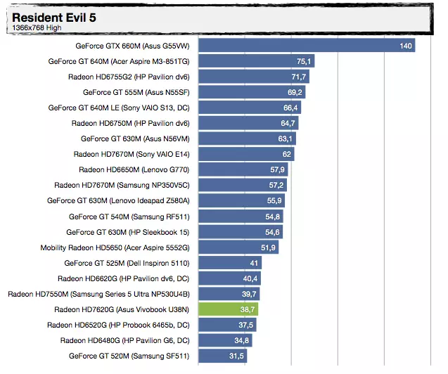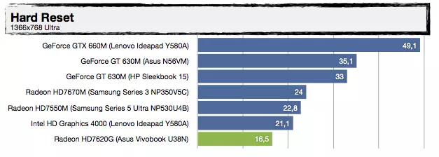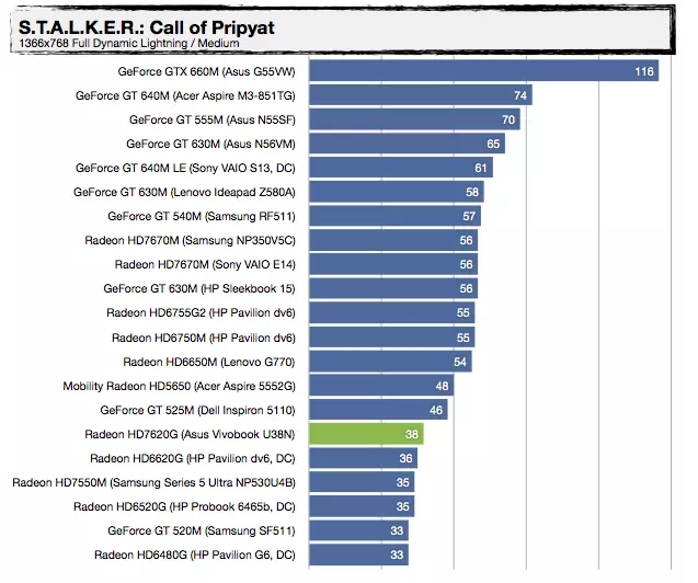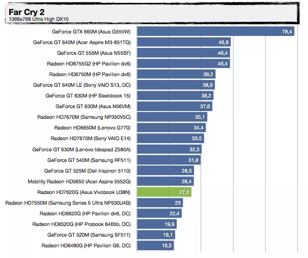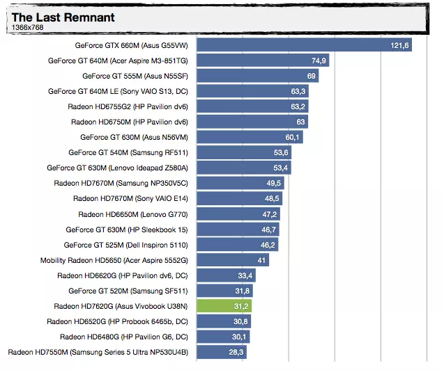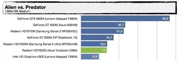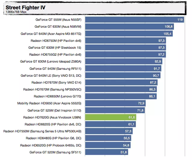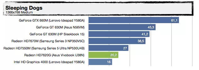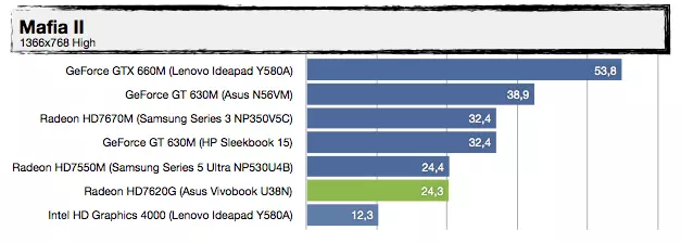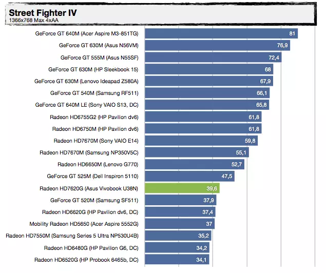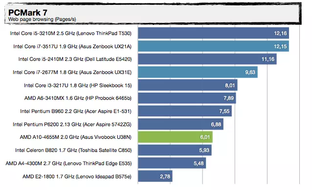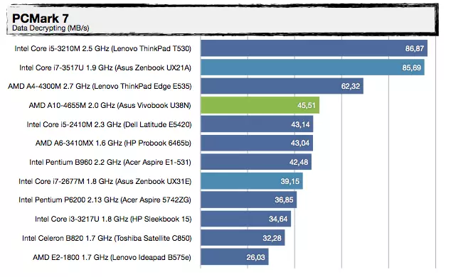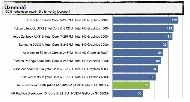 Most, hogy tudjuk a háttérinformációkat, nézzük, mit tud felmutatni az AMD Trinity alapokra építkező Vivobook U38N. Visznylag sokat, de ahogy növeljük a terhelést, úgy szakad le a konkurens architektúrától, érdemes az UX31E-vel való összehasonlítást megnézni. Az UX21A-val nagyjából tudja tartani a versenyt, de azt is főleg azért, mert a kis Zenbook Prime-ban egy közel 30%-kal kisebb kapacitású akkumulátor van. A specifikáció tehát igaznak bizonyult, jó hír viszont, hogy az alacsonyabb üzemidőért cserébe ténylegesen használható 3D-s támogatást kapunk a Radeon HD7620G személyében, így a játékok futtatása kevésbé tűnik irreálisnak, mint egy mezei Ultrabook esetében – valamit valamiért. Érdekes lehet az A8-4555M-mel szerelt változat, abban ugyanis egy picit gyengébb (de még mindig négymagos) APU van egy csökkentett órajelű Radeon HD7620G-vel (alias Radeon HD7600G), 25%-kal kisebb fogyasztási mutatóval.