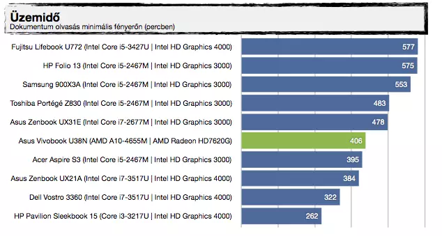 Értelmezzük a látottakat. Három Asus készülékre érdemes fókuszálni a mezőnyből. Az egyik értelemszerűen jelen tesztünk alanya, az U38N, a másik kettő pedig egy jelenlegi (UX21A), illetve egy előző generációs (UX31E) Zenbook. Érdemes róluk tudni, hogy míg az UX21A akkumulátorának kapacitása (35 Wh) és kijelzőjének mérete (11,6”) is kisebb a Trinity-s U38N-nél, addig az UX31E esetében a kijelző mérete már stimmel, az akkumulátor viszont kicsit izmosabb (50 Wh), mint jelenlegi tesztalanyunké.