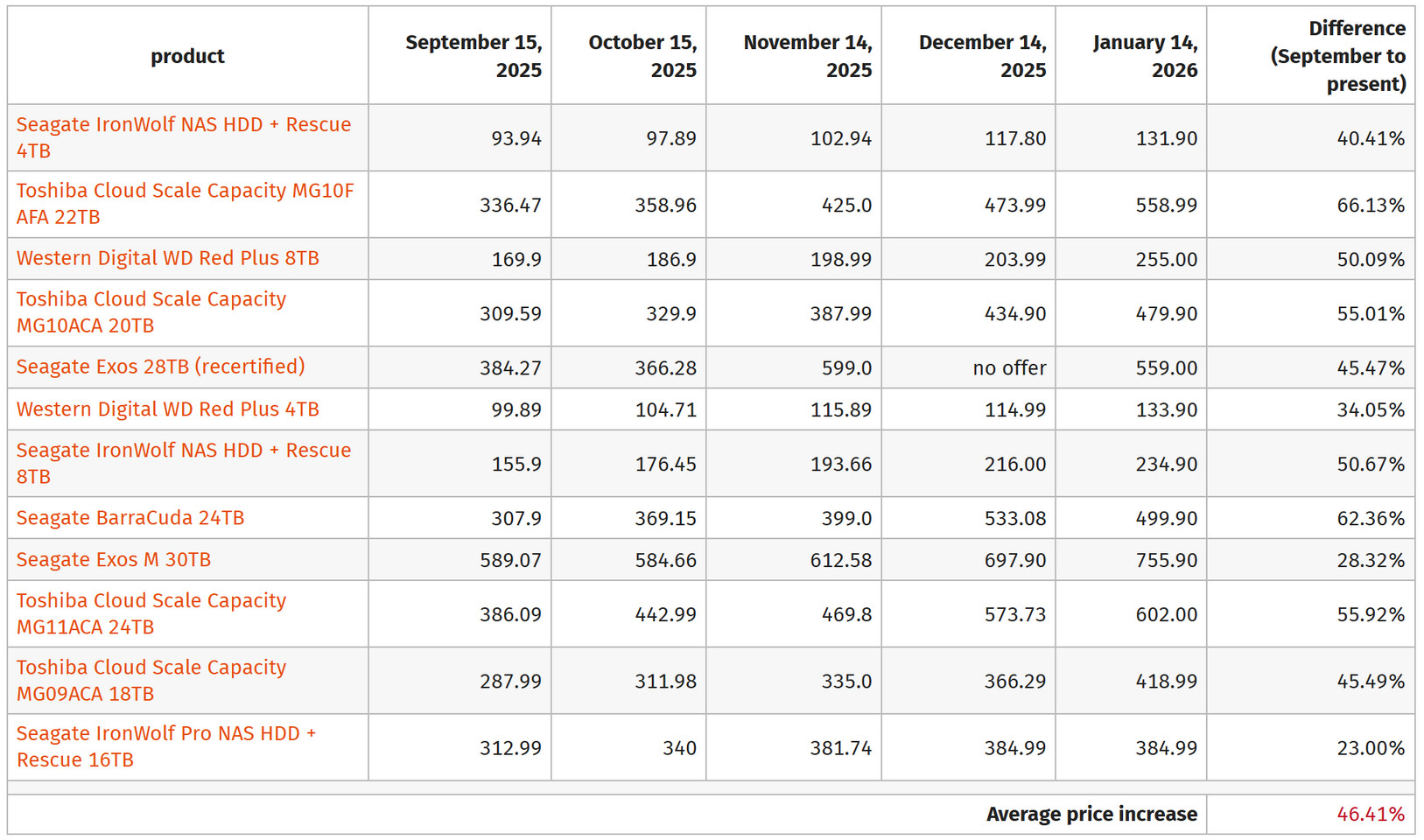 A memóriahiány miatt régóta drágulnak a DRAM chipeket tartalmazó termékek, különösen a DDR5-ös memóriamodulok esetében szembetűnő a folyamat, de DDR4-es társaik is egyre többe kerülnek, ami azt eredményezte, hogy a DDR3-as platformok iránt elkezdett élénkülni a kereslet. A NAND Flash alapú termékek szegmensében szintén drágulás tapasztalható, csak úgy, ahogy a videokártyáknál is, és meglepő módon a merevlemezek sem maradtak ki a sorból. Noha ezek az adattároló nem tartalmaznak olyan komponenseket, amelyekből hiány van és amelyek az elmúlt időszakban jelentősen megdrágultak volna – leszámítva a kis mennyiségű DRAM alapú gyorsítótárat – mégis jókora drágulás körvonalazódik az egyes modellek esetében, ami érzékenyen érinti a vásárlókat és a piaci szereplőket is.
