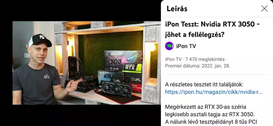 A videó címe mellett már van egy lefelé mutató nyíl, amivel be lehet nyitni a videó mellé a műsornak a leírását, így lényegében kettő részre lesz felosztva a képernyő. A bal alsó sarokban megjelent egy sor ismerős gomb. Van már itt azonnal elérhető like és dislike gomb, behozhatóak a hozzászólások, felvehető a tartalom a mentett dolgok közé, és lehet innen rögtön megosztani. A hozzászólások ugyanúgy jönnek be, mint a leírás, és úgy lehet kommentálni, hogy közben a videó is megy és folyamatosan látszik. A jobb sarokban pedig van egy új gomb a lejátszási listához, ami eddig felfelé húzással volt elérhető.