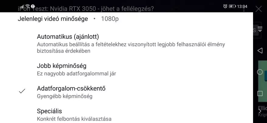 Lejátszás közben a felfelé legyintéssel továbbra is el lehet érni a lejátszási sort, és innen az éppen megnézett videónak a csatornájára is át lehet menni, valamint a feliratkozás is megoldható rögtön innen. A beállításokon belül a minőségnek az állítását valamelyest megbonyolította a Google, itt már van kiemelten Ajánlott, Jobb minőség és Adatforgalom-csökkentő opció, ez utóbbi kettő pedig a felbontástól független, szóval van forgalomcsökkentett Full HD is, példának okáért. Aki manuálisan akarja a kívánt felbontást elérni, annak le kell tekerni a Speciális lehetőséghez.