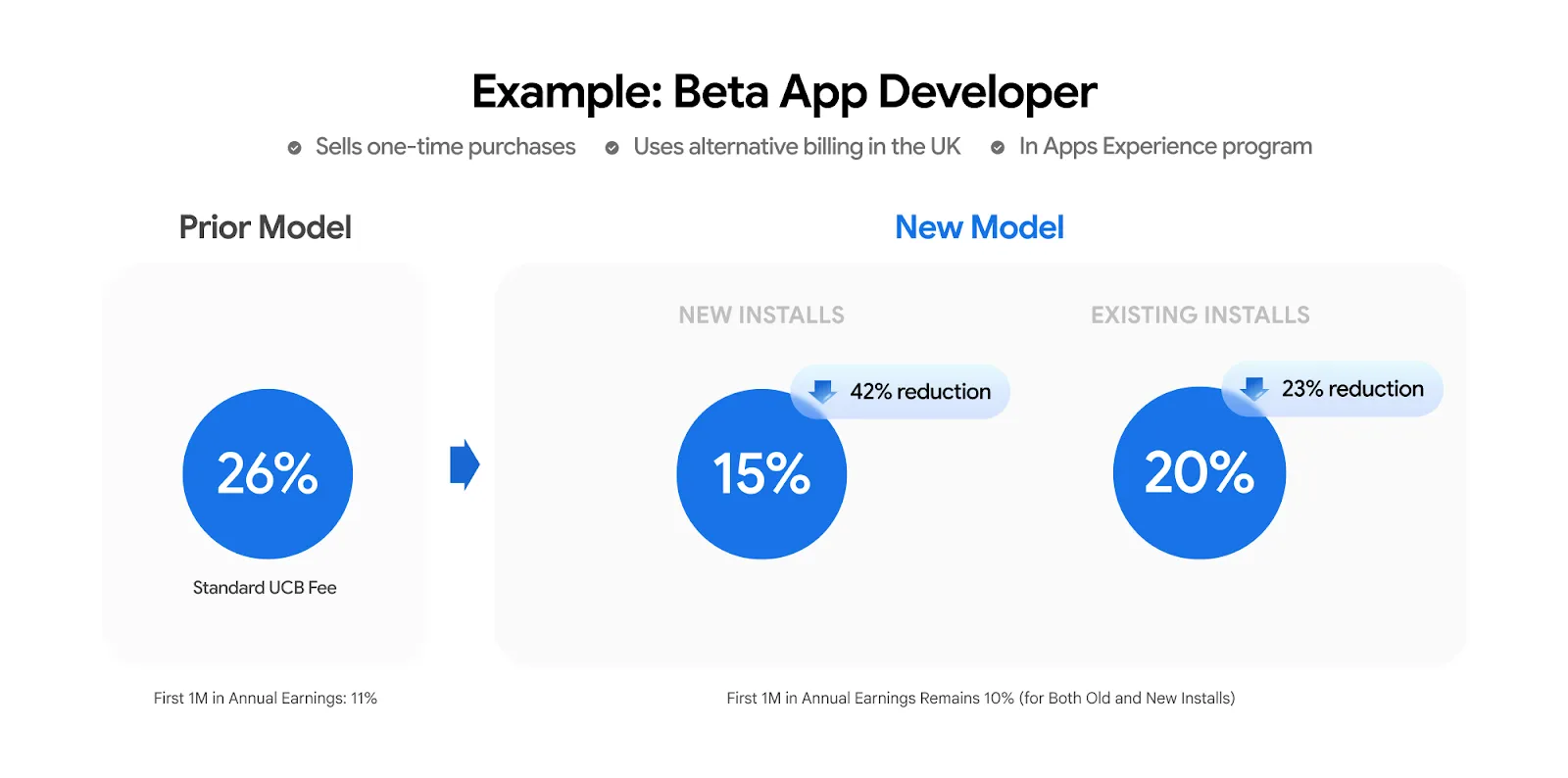 A vállalat meglehetősen komplex új fizetési rendszert alakított ki, amiben a fejlesztők úgy járhatnak majd a legjobban, ha csatlakoznak a Games Level Up és az Apps Experience programokhoz. Ezek is újítások. Az említett két program révén a fejlesztők akár 5 százalékkal csökkenthetik a cég felé fizetendő jutalékot, ha megfelelnek az ezekben foglalt elvárásoknak.