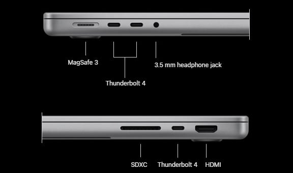 A SoC egységről és a rendszermemóriáról fentebb már említést tettünk, az adatok tárolását pedig SSD végzi, ami alap esetben 512 GB-nyi kapacitással bír, de 1 TB-os, 2 TB-os, illetve 4 TB-os modell is elérhető. A portok között továbbra is jelen van a HDMI videó kimenet, az SDXC memóriakártya-olvasó, illetve a 3,5 milliméteres Jack Audió csatlakozó is, valamint kapunk három darab Thunderbolt 4-es portot is, amelyek akkumulátortöltésre, kijelző meghajtására, illetve adatátvitelre is használhatóak, és az USB4 szabványt is támogatják.