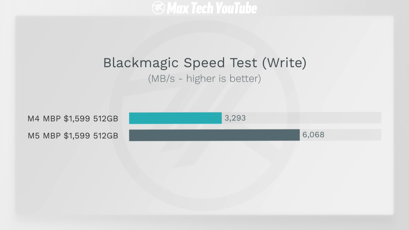 Az új MacBook Pro az Apple állításával ellentétben nemcsak kétszeres, hanem akár háromszoros sebességnövekedést is fel tud mutatni ahhoz képest, amit az M4-es SoC egységgel ellátott MacBook Prónál megszokhattunk – erre mutat rá a Max Tech YouTube csatorna tulajdonosa, aki nemrégiben letesztelhette az M4-es és az M5-ös MacBook Pro noteszgépek SSD alrendszerét. A BlackMagic Disk Speed Test alapján az M5-ös MacBook Pro esetében a maximális folyamatos olvasási sebesség 6323 MB/s.ra rúgott, míg ugyanez az érték az M4-es verziónál csak 2031 MB/s volt.