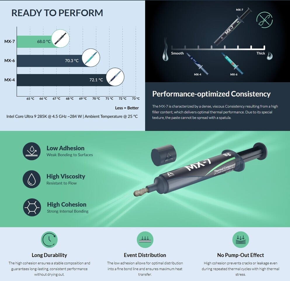A gyártó belsős mérései szerint az MX-7-es paszta használata mellett egy Core Ultra 9 285K típusú processzor 4,5 GHz-es órajel mellett 68 Celsius fokos üzemi hőmérsékletet produkált 25 Celsius fokos környezeti hőmérséklet mellett, vagyis 2,3 Celsius fokkal hűvösebben üzemelt, mint az MX-6-os paszta mellett, illetve 4,1 Celsius fokkal előzte meg az MX-4-es pasztát, ami nem hangzik rosszul. A paszta tényleges teljesítménye persze sok tényezőtől függ, például a leszorítás erősségétől, a felületek érintkezésétől, illetve attól is, hogyan és milyen vastagon tölti ki az adott felületek közötti teret a hővezető anyag.