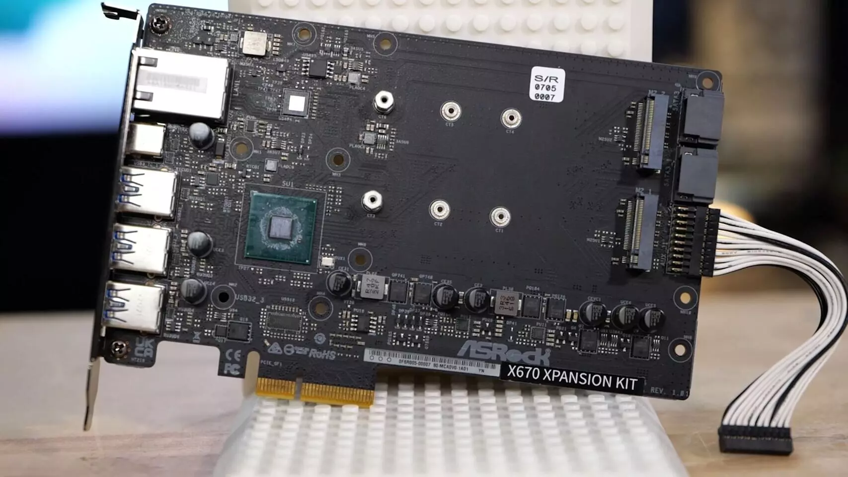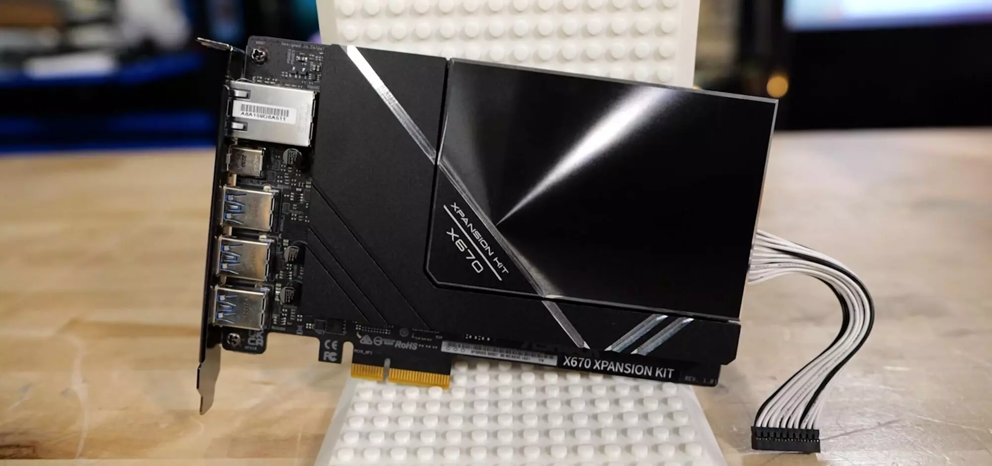 Remek példa erre az a bővítőkártya, amellyel a B650 Live Mixer alaplapból többé-kevésbé X670-es szintű deszkát lehet varázsolni. Az X670 Xpansion Kit névre keresztelt megoldás igazából egy olyan bővítőkártya, amelyen egy lapkakészletet helyeztek el, ez a szett egy PCI Express x4-es csatolófelület használatával kapcsolódik a rendszerhez, ám használatához a jelek szerint egyéb dolgokra is szükség van – például megfelelő szoftveres támogatásra. Az újdonság egy speciális kábel alkalmazását követeli meg, ami szintén részt vesz a kommunikációban, talán alacsony sebességű protokollt használva, mint amilyen az SPI, illetve az I2C.