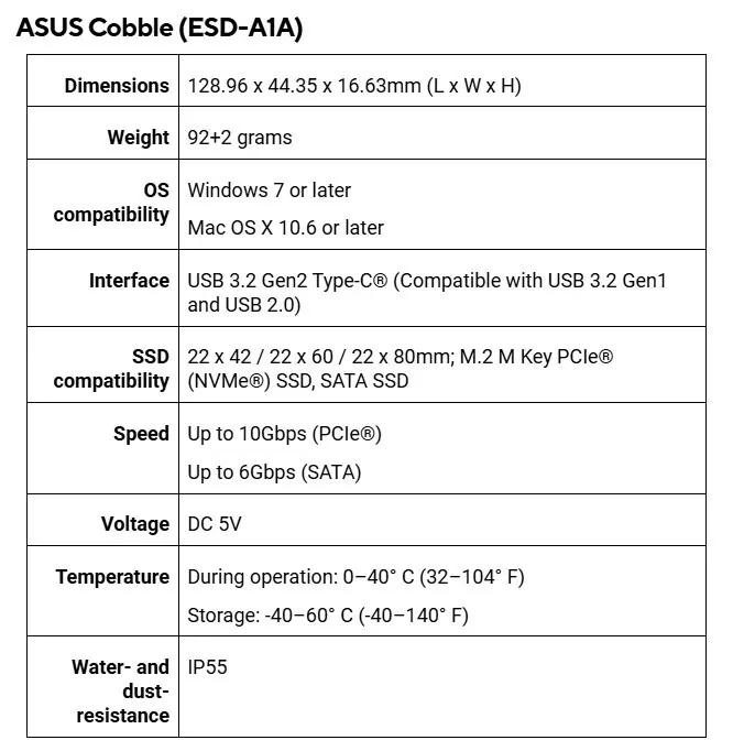 Az ASUS Cobble (ESD-A1A) a gyártói tájékoztatás szerint Windows 7 vagy frissebb Windows, illetve macOS 10.6-os vagy frissebb macOS operációs rendszerekkel használható. A termék remekül passzol a különböző noteszgépekhez, mobileszközökhöz, illetve akár játékkonzolokhoz is.