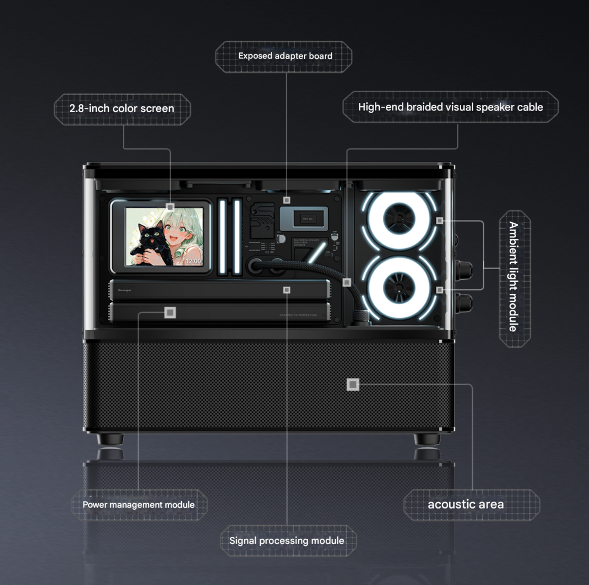 Annak érdekében, hogy a dizájn még valósághűbb lehessen, egy klasszikus PC felépítését utánozták, így rejtették el a tápellátással és a jelfeldolgozással foglalkozó komponenseket egy speciális házba, ami formavilága miatt egy klasszikus gamer videokártyára emlékeztethet. A manapság oly divatos kétkamrás felépítést imitáló ház felső részén helyet kapott egy 2,8 hüvelykes képátlójú színes LCD kijelző is, ami alap esetben animációkat jeleníthet meg.Ez a komponens a mai modern kompakt folyadékhűtő rendszerek folyadékhűtő blokkjára emlékeztet, mellette pedig két fehér LED csíkot alakítottak ki, ami az RGB LED világítással ellátott memóriamodulokat szimbolizálja – ezekből azért van kettő, mert egy normál Mini-ITX formátumú alaplap jellemzően csak két memóriamodult fogad, helytakarékossági okokból. A rendszer tartalmaz még két szövetbevonatú kábelt is, amelyek a folyadékhűtő szett csöveit szimbolizálják, ezek pedig egy rácsos alsó komponenshez futnak, amit akár hőleadó radiátorként is értelmezhetnénk – a cél mindenképpen ez volt. A hát első részén még némi extra világítást is elhelyeztek, ami a klasszikus rendszerhűtő ventilátorokat szimbolizálja.