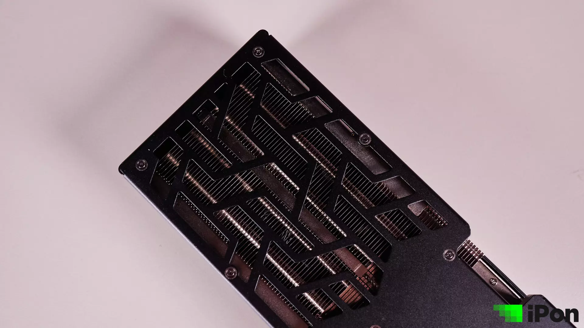 És ha már a túlméretezett hűtést említettük, ez a masszív hűtőborda lényegében kétszer hosszabbra sikerült, mint a kártya, amire ráépítették. A harmadik ventilátor pedig szinte akadálymentesen pörgeti át a levegőt a lamellákon, mivel a fém takarólemez a nyák végeztével részben nyitottá válik. Annyi biztos, hogy semmi akadálya a kompakt PC-khez szánt low profile verziók érkezésének, dupla ventilátoros kiadás pedig már most is kapható, pl. a Gainward Ghost kártyáinak képében. További pozitívum, hogy ehhez az energiaigényhez egy hagyományos, 8-pines PCIe csatlakozó társul, így sem drága cserekábelre, sem a merev és ormótlan adapterre nem lesz szükségünk. Nem úgy, mint az Nvidia 16-pines házi megoldásánál, melytől a többi gyártó szerencsére szabadon eltérhet. Akinek tehát legalább egy minőségi 650 wattos táp a rendelkezésére áll, annak nem kell új egységre, vagy moduláris kiszerelés esetén az átalakítónál sokkal megbízhatóbb cserekábelre költenie.