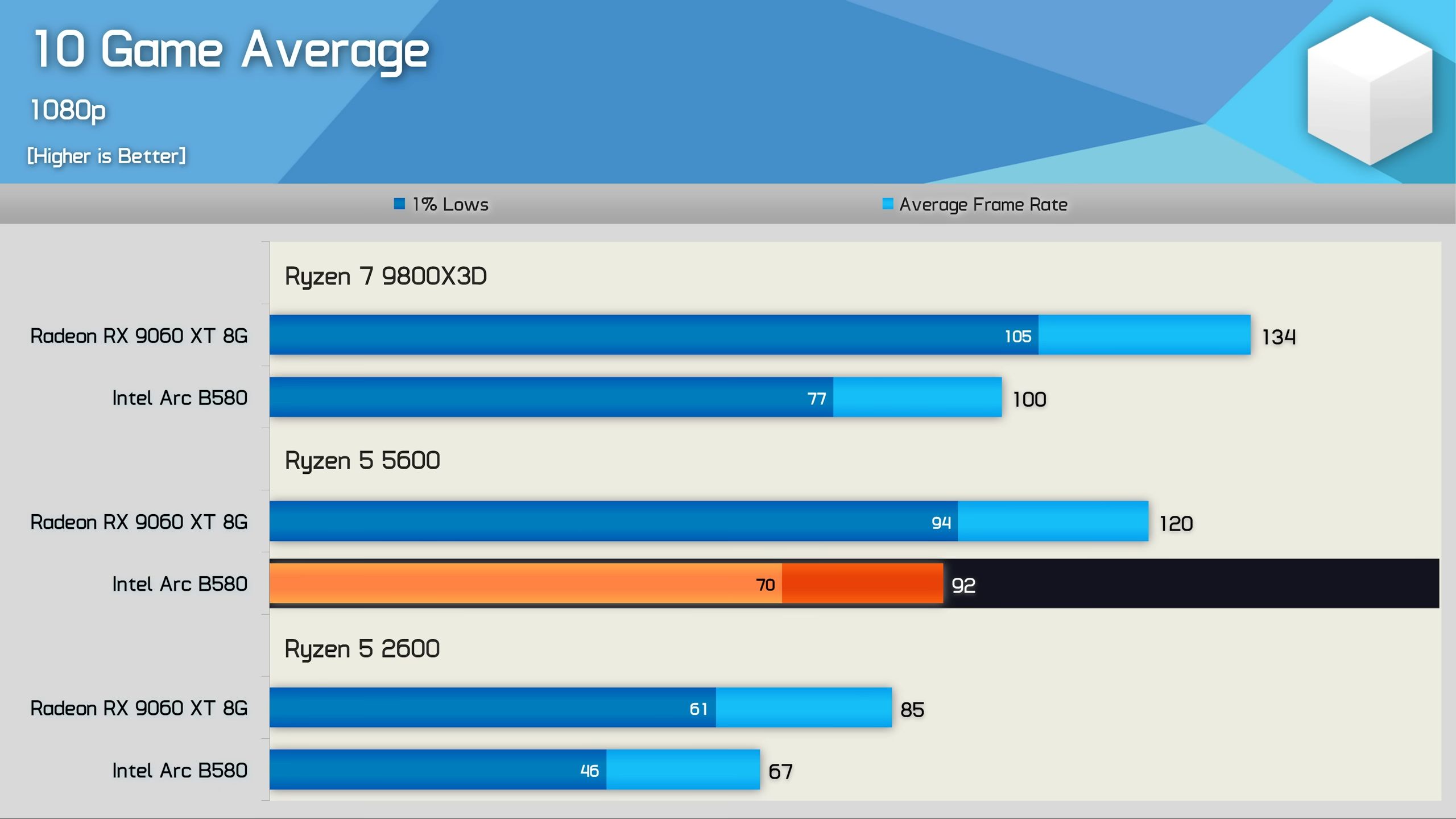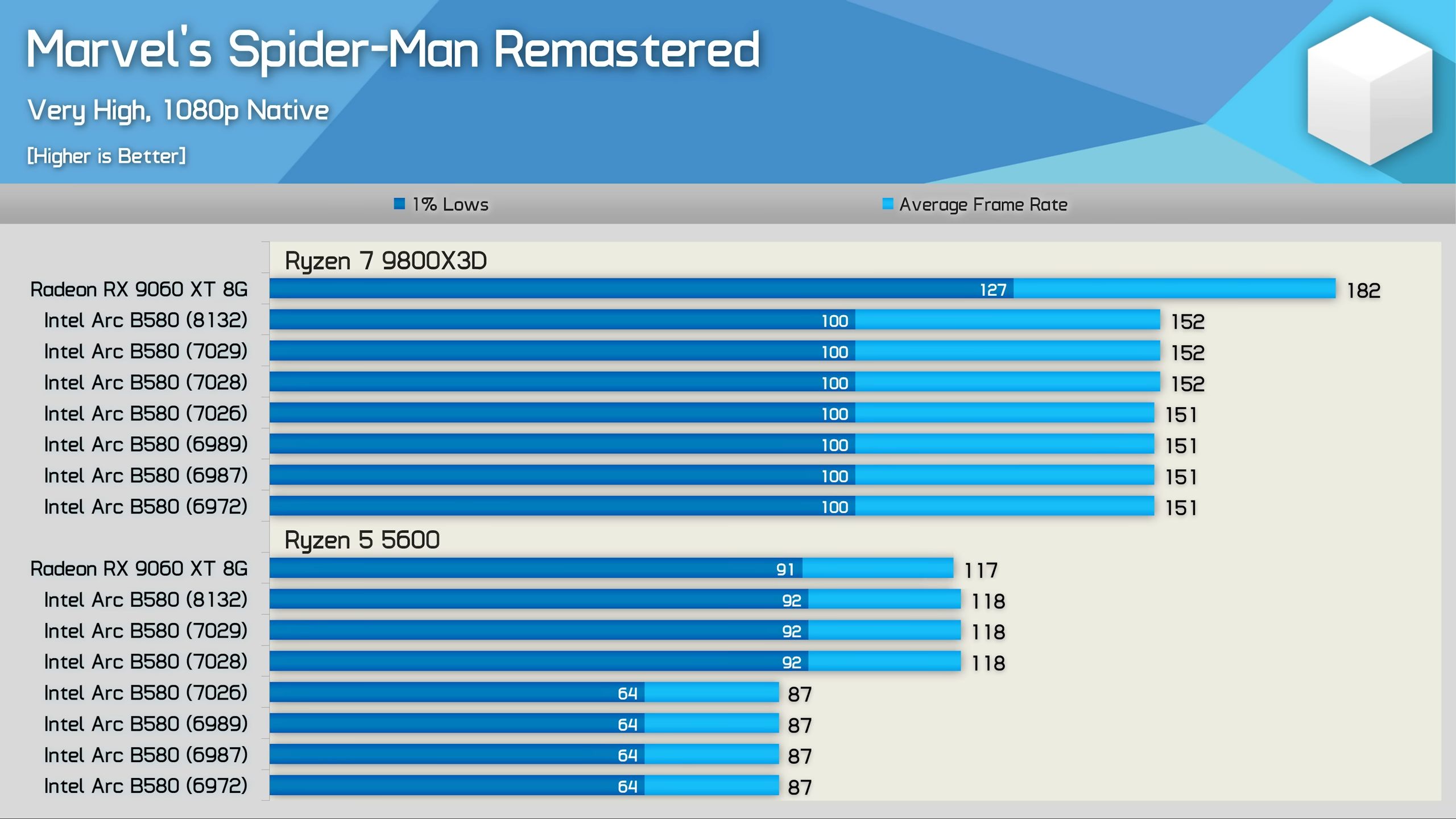 Eleinte úgy tűnt, hogy a fenti jelenség, vagyis az, hogy régebbi processzor mellett az elvárhatónál nagyobb mértékben lassulnak az Intel Arc sorozatú videokártyák, hardveres okokra vezethető vissza, így a helyzet nem is fog változni, de szerencsére a fenti mérések cáfolják ezt a feltevést: szoftveres optimalizációval igenis lehet tenni a helyzet javításáért. A fentiek alapján CyberPunk 2077 és Spider-Man Remastered alatt jelentősen gyorsult az Arc B580 a RYZEN 5 5600-as processzor alkalmazása mellett a korábbi teljesítményszinthez képest, így most már versenyképes teljesítményt tud felmutatni CPU intenzív játékok alatt is. A korábbi driverekkel a potenciális teljesítménynek akár 30%-is kárba veszhetett az akkori helyzet miatt, vagyis a javítás esetenként jelentős gyorsulást hoz.