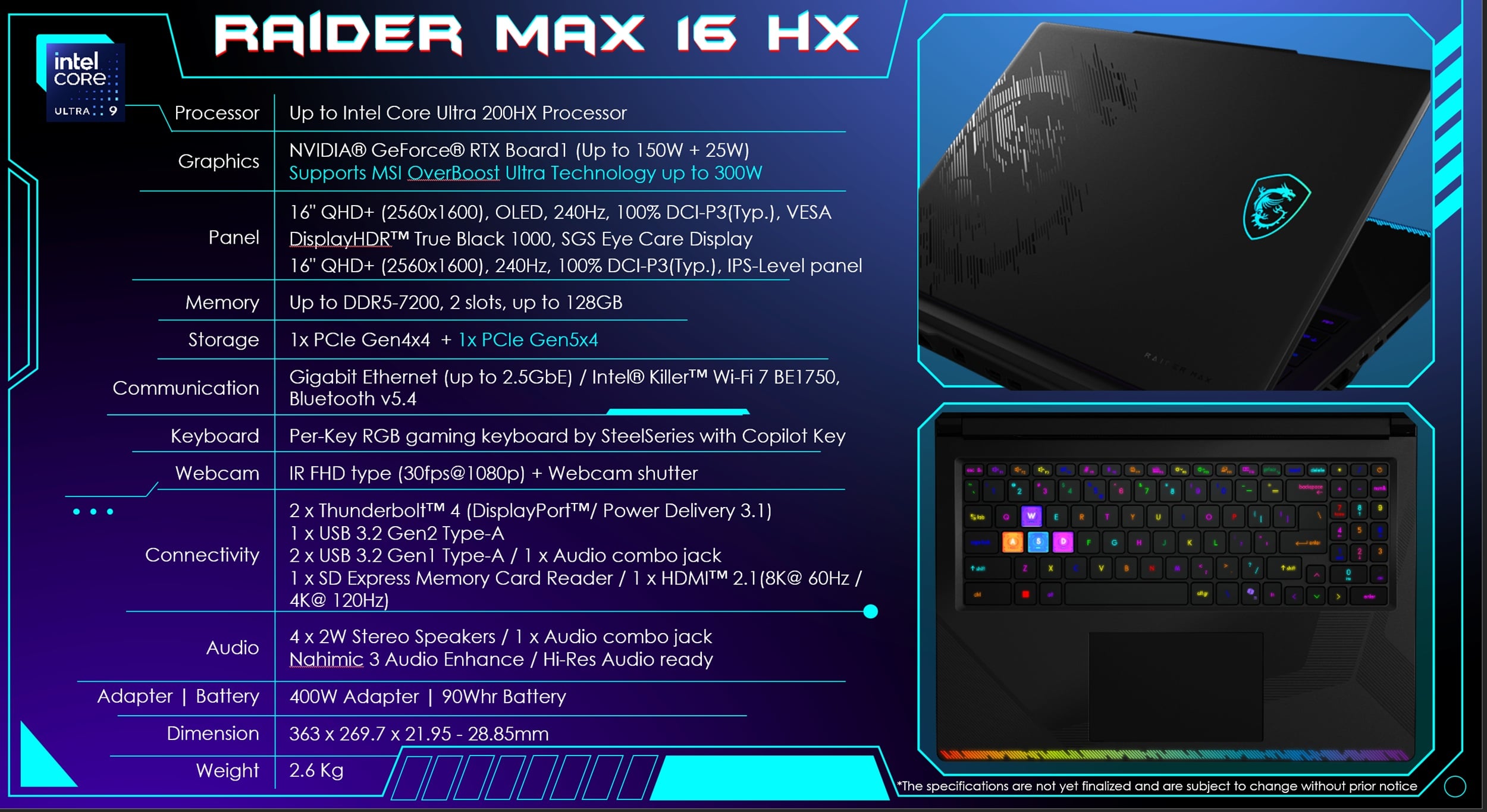Az új notebook 90 wattórás akkumulátorral és 400 W-os tápadapterrel érkezik. A termék 363 milliméter széles, 269,7 milliméter mély és maximum 28,85 milliméter vastag lesz, de legvékonyabb pontján mindössze 21,95 millimétert mérhetünk. A nagyteljesítményű gamer notebook 2,6 kilogrammot nyom majd a mérlegen.