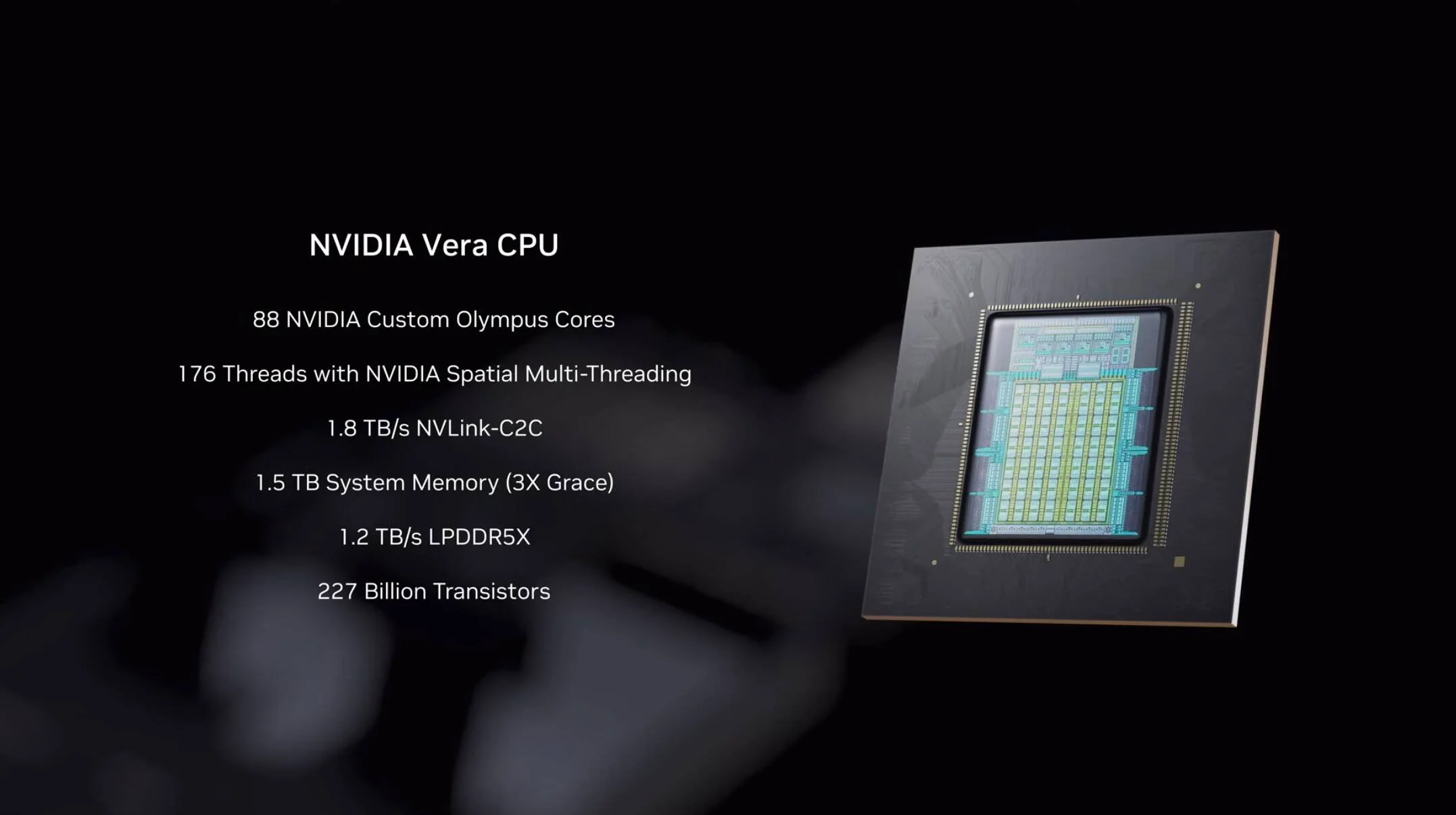 A Vera processzor összesen 88 maggal és 176 szállal gazdálkodik, architektúra terén viszont már nem az ARM kész megoldását használja, min a korábbi Grace, hanem egy saját fejlesztésű, az ARM v9.2-A architektúra köré épülő Olympus processzormagot, ami több szempontból is különleges. Az új processzormag egyik fontos előrelépése, hogy újragondolja az SMT, azaz a Simultaneous Multi-Threading technológiát, helyette pedig Spatial Multi-Threading módszert vet be, amelynél nincs időszeletekre osztva a kulcsfontosságú komponensek használata az adott processzormaghoz tartozó két szál között, helyette fizikailag különítik el a futószalag különböző komponenseit.
