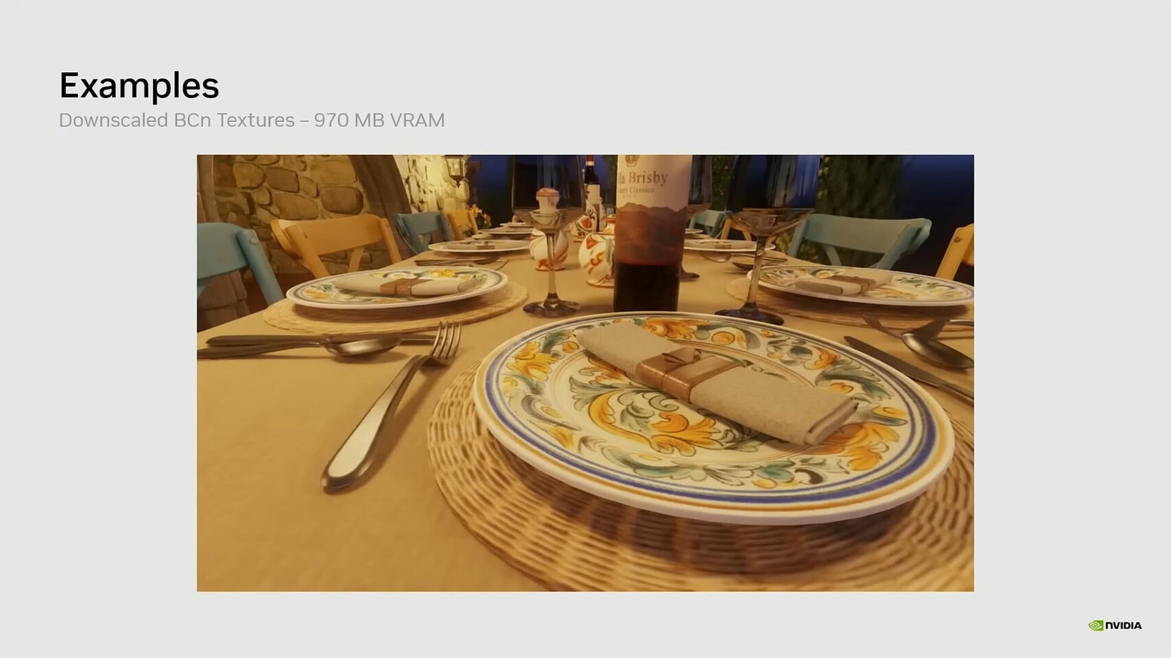 A demó alkalmával egy toszkán villát mutattak be kívül, illetve belül, ahol meg lehetett csodálni, hogyan dolgozik élesben a Neural Texture Compression technológia. A képek alapján minőségkülönbséget nem igazán lehetett látni a normál és az NTC-vel készített textúrák között, lényegében mindkettő ugyanazt a szintet képviselte, de míg normál esetben a textúrák 6,5 GB-nyi VRAM-ot foglaltak, addig a Neural Texture Compression révén ezt az értéket 970 MB-ra sikerült csökkenteni. Ebben az esetben lényegében hétszer kisebb lett a memóriafoglalás mértéke, ami sok új lehetőség előtt nyitja meg a kapukat, hiszen a felszabaduló memóriakapacitást jobb minőségű textúrák bevetésére lehet használni, de arra is alkalmas, hogy a játékhoz kapcsolódó egyéb funkciók számára szabadítson fel értékes VRAM-területet.