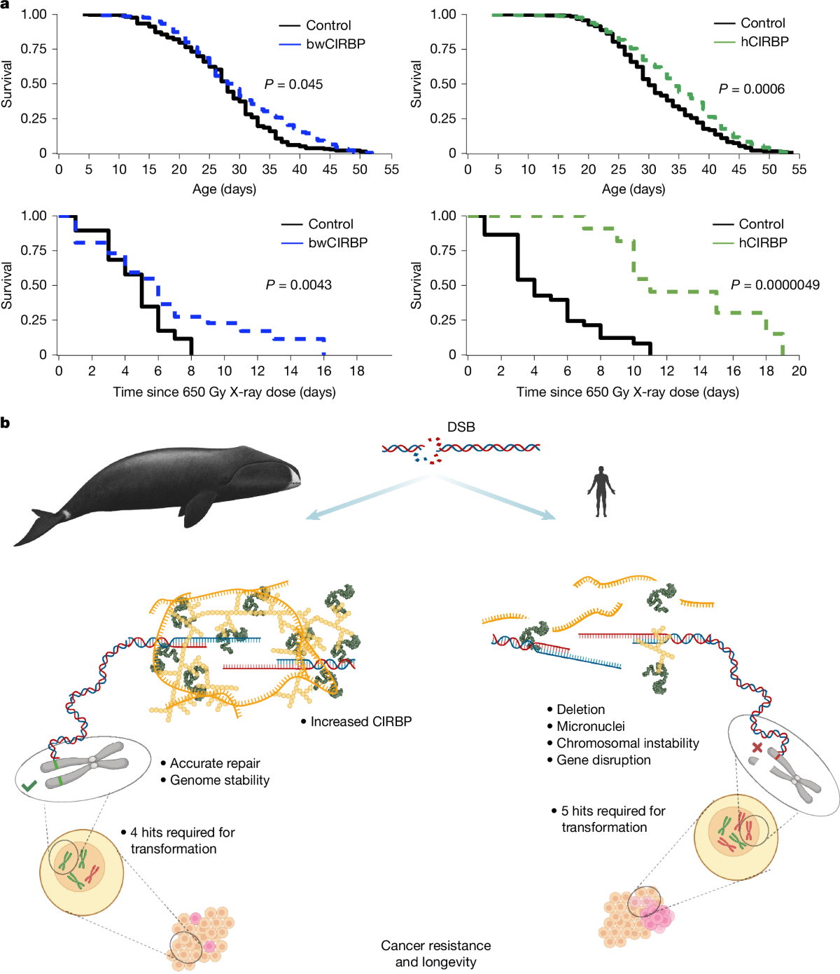 A DNS-javító fehérje és az azt termelő gén kulcsfontosságúnak tűnik a grönlandi bálnák hosszú élettartamának biztosításában. Az állatok élete során a sérült DNS felhalmozódik a testben, ami számos betegséghez vezethet a rákon kívül is. Amikor a kutatók a grönlandi bálna CIRBP génjét a muslicákba juttatták, azok hosszabb ideig éltek, mint azok a rovarok, akikben a gén normál változata volt jelen.