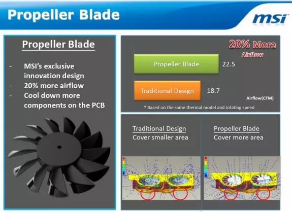 A 8+2 fázisú tápellátással érkező videokártyán természetesen egyedi hűtést találunk, ami nem más, mint egy Twin Frozr III-as sorozatú megoldás, amely a referencia hűtőknél halkabban és hatékonyabban hűti a GPU-t. A hűtő öt darab, rézből készült hőcsővel, számos alumínium lamellával, valamint két darab 80 mm-es átmérőjű ventilátorral rendelkezik. A ventilátorok zajszintje a gyártó állítása szerint terhelés alkalmával 7 dB(A)-lel alacsonyabb, mint a referencia modelleké, ez pedig nem elhanyagolható előny. Az egyedi hűtés és az erős tápellátás - a hagyományos modelleken 4+1 fázisú VRM áramkör lapul - rendkívül nagy mértékben hozzájárulnak az extrémebb mértékű tuning sikeréhez.