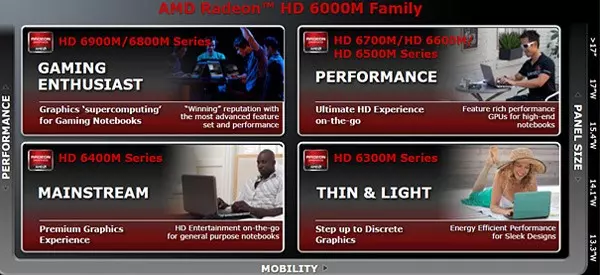 Néhány hete a Radeon HD 6300M és Radeon HD 6500M sorozatú videó vezérlők már bemutatkoztak, ám most a család többi tagjáról is lehullt a lepel, így az AMD hamarosan a teljes mobil szegmenset lefedheti friss videó vezérlőivel. Az új videóvezérlők mindegyike támogatja a gyártó PowerPlay technológiáját, ami az energiatakarékos működésért felel, valamint mindegyikük támogatja a HDMI 1.4a szabványt is. A Radeon HD 6000M család tagjai ezen kívül HD3D támogatással érkeznek, ami annyit tesz, hogy támogatják a sztereoszkópikus 3D technológiát, képesek a 3D-s Blu-ray filmek lejátszására és a harmadik fél által készített sztereoszpikus 3D szoftverek sem okoznak fejfájást nekik. Az újdonságok emellett EyeSpeed támogatással is bírnak, ami az alábbiakat foglalja magában: