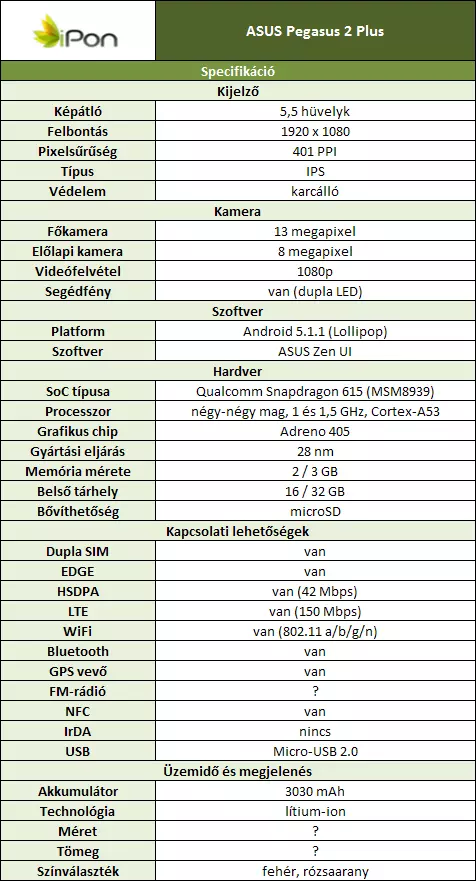 Az ASUS előszeretettel alkalmaz Intel központi chipeket, ám ezúttal egy Qualcomm SoC dolgozik a színfalak mögött. Az MSM8939 lapka van a Pegasusban, ami a Snapdragon 615 széria tagjaként született meg. Ez a nyolcmagos chip a big.LITTLE architektúrára épül, azonban egyforma Cortex-A53 magok találhatóak benne, csak éppen eltérő 1 és 1,5 GHz-es órajelen. A grafikus feladatok felelőse egy Adreno 405 IGP, ami szerényebb felbontás mellett már egészen jól muzsikálna, de azért így sem kell félteni. A rendszermemóriát és a háttértárat figyelembe véve két különböző konfiguráció lesz kapható. A Pegasus 2 Plus elérhető lesz 3 GB-nyi RAM-mal, amihez 32 GB-nyi tárhely kapcsolódik, alacsonyabb árért cserébe azonban elvihető a gép 16 GB-os kapacitással és 2 GB memóriával is. A háttértár esetében egyébként van bővítési lehetőség, így talán az nem olyan perdöntő szempont a vásárláskor. Az ASUS új reménysége egy négyes kategóriájú 4G LTE hálózati modemmel látta meg a napvilágot. A kapcsolati képességeinek lajstromán van 802.11 a/b/g/n Wi-Fi, Bluetooth 4.0 LE modul, A-GPS vevő és még NFC chip is – ennek köszönhetően akár fizetni is lehet majd a mobillal. A készülék azoknak kedvez, akik egyszerre több SIM-et használnak, hiszen két hálózati kártyának van hely a borítás alatt.