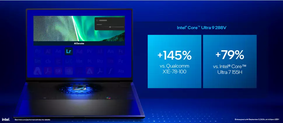 Lightroomban a Qualcomm chiphez képest 145%-os, a Meteor Lake SoC-hoz képest pedig 79%-os előnyt ért el a Lunar Lake, míg After Effects alatt már csak a Meteor Lake SoC képezhette összehasonlítás alapját, aminél 54%-kal gyorsabb volt a Lunar Lake, ugyanis ez a teszt a Qualcomm SoC egységén egyszerűen nem indult el. A gyártó megemlítette még azt is, hogy a Qualcomm és az AMD termékeivel szemben a Lunar Lake fedélzetén található NPU nemcsak INT8, hanem FP16 pontossággal is képes dolgozni, ami sok esetben előny lehet.