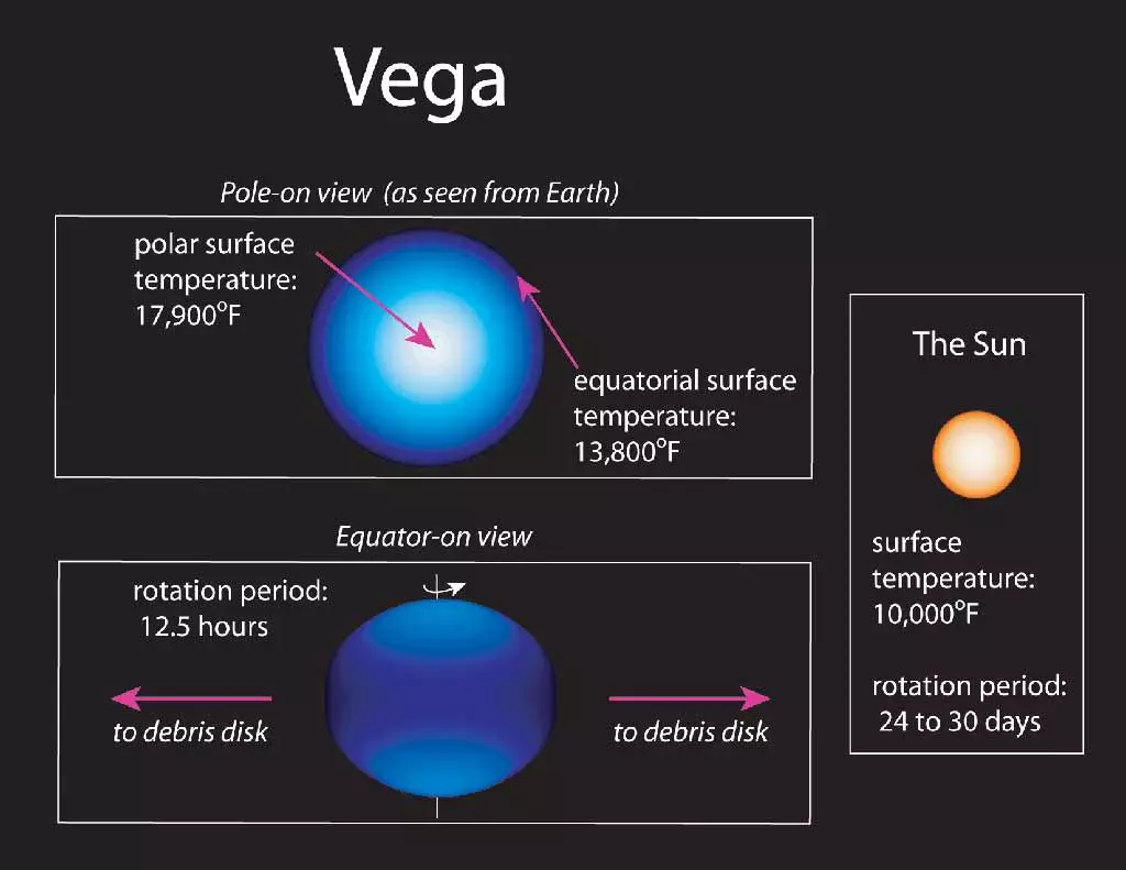 A Vega egy A típusú csillag, nagyjából kétszer annyit nyom, mint a Nap, meglehetősen fiatal, mindössze 700 millió éves, és nagyon gyorsan forog. Forgása annyira sebes, hogy tengelye mentén ellaposodott, és egyenlítői átmérője nagyjából 10 százalékkal nagyobb, mint a poláris átmérő. Orientációjának köszönhetően pedig majdnem pontosan felülről látunk rá, vagyis forgástengelye mentén figyelhetjük meg a csillagot.