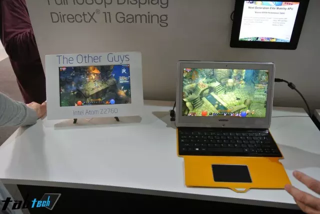 Annak érdekében tehát, hogy remekül látszódjon, mekkora GPU teljesítmény előnyben van a Temash APU az Intel Atom Z2760-as SoC egységgel szemben, a vállalat illetékesei egy érdekes bemutatót is szerveztek, amelynek keretén belül egymás mellé került egy Intel Atom alapú, illetve egy AMD Temash alapú tábla. Előbbit diszkréten egy beborították fehér műanyag kerettel, hogy ne derüljön ki, pontosan melyik AMD partner készítette, hiszen az AMD nem szeretné kellemetlen helyzetbe hozni az adott gyártót.