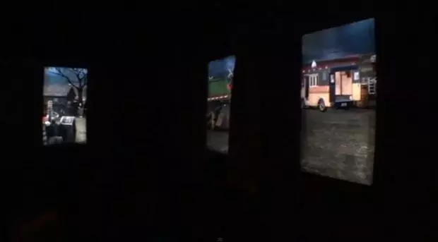 A bemutató résztvevőit egy sötét szobába invitálták, amelyben több Full HD TV is jelen volt. A portré módba forgatott televíziók mindannyian 1080p-s felbontás mellett üzemeltek - szám szerint nem kevesebb, mint tíz volt belőlük. Ezek a megjelenítők gyakorlatilag ablakokat helyettesítettek, amelyeken "kitekintve" különböző érdekes szituációk voltak megfigyelhetőek.