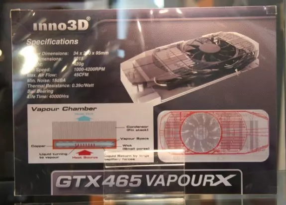 A gyártó a Galaxyval ellentétben nem a GTX 400-as család legnagyobb, hanem a legkisebb tagját szerelte fel a különleges hűtővel. A pár napja megjelent GeForce GTX 465-ös modellen egy kétslotos hűtő van jelen, amely öt darab hőcsővel és egy nagyméretű, golyóscsapágyas kivitellel rendelkező ventilátorral büszkélkedik. A légkeverő fordulatszáma a terhelés függvényében változik a percenkénti 1000-es és 4200-as fordulatszám-tartományon belül. A hőkamrás hűtő 420 grammos súllyal bír és 18 dB(A) minimális zajszint mellett dolgozik.