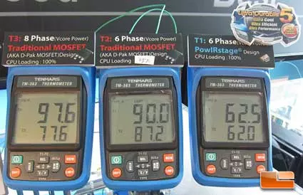 A hagyományos komponensekből álló nyolcfázisú VRM áramkör üzemi hőmérséklete 97,6 Celsius fokos volt, ettől nem sokkal maradt le az ugyancsak hagyományos komponenseket alkalmazó, de már csak hat tápfázist kínáló megoldás, ami kereken 90 Celsius fokos üzemi hőmérséklet mellett dolgozott. Ezzel szemben a PowIRstage IR3550 alapú VRM áramkörrel ellátott, Ultra Durable 5 dizájn alkalmazásával készített alaplapnál a hatfázisú VRM áramkör üzemi hőfoka mindössze 62,5 Celsius fok volt.