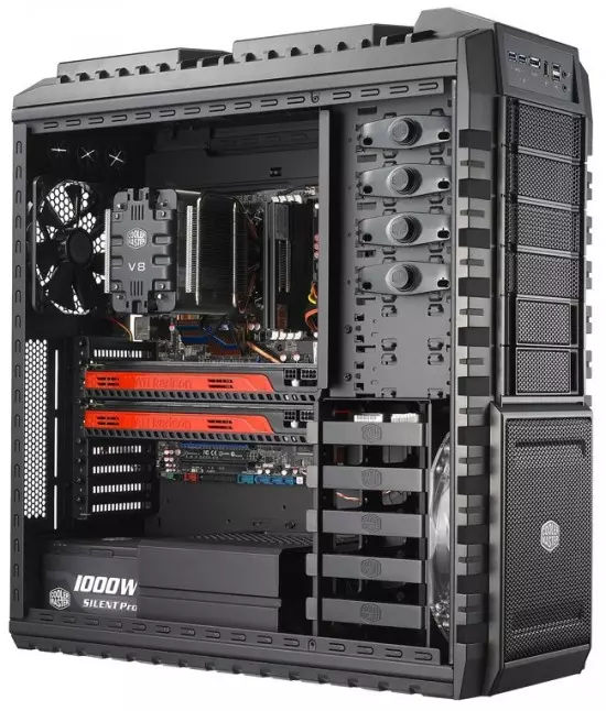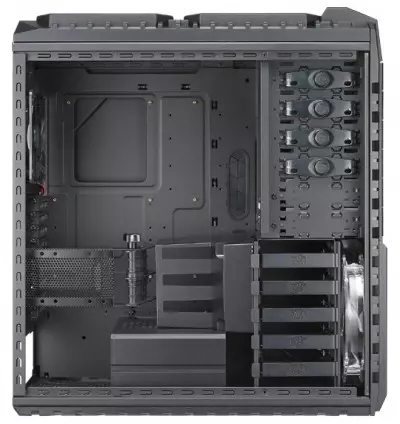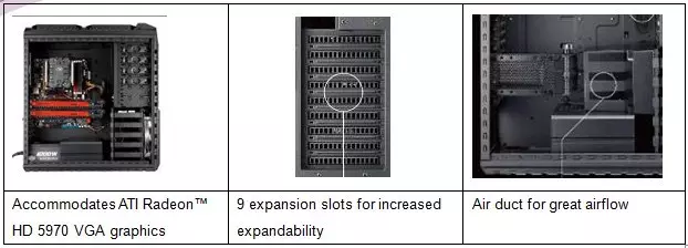A kívül-belül feketében pompázó ház 230 x 550 x 590 mm-es mérettel és 14,35 Kg-os súllyal büszkélkedik. Az acél vázra épülő termék teljes egészében szerszámmentes szerelhetőséget kínál, és fejlett kábelmenedzsmenttel érkezik, így a táp- és egyéb kábeleket hatékonyan elrendezhetjük, hogy azok ne akadályozzák a rendszer szellőzését. Maga a ház egyébként hat darab 5,25 hüvelykes és 5 darab 3,5 hüvelykes bővítőhellyel büszkélkedik és M-ATX, ATX, valamint E-ATX alaplapok fogadására lett felkészítve. PCI slotból nem kevesebb, mint kilenc áll rendelkezésre, de a gyártó nagy figyelmet fordított arra is, hogy felsőkategóriás videokártya vagy videokártyák alkalmazásakor is a lehető legjobb szellőzést biztosítsa a rendszer számára.