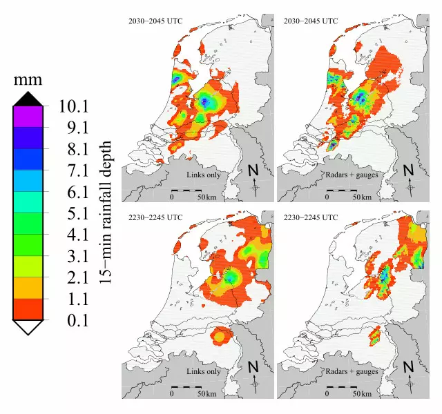 A felvetés nem új, voltak már próbálkozások a megvalósításra is, de ez az első alkalom, hogy egy teljes országra alkalmazták a technikát: Aart Overeem és kollégái a T-Mobile bázisállomások közti 2400 linket elemezve 15 percenként friss esőtérképet tudtak szolgáltatni Hollandia egész területéről.