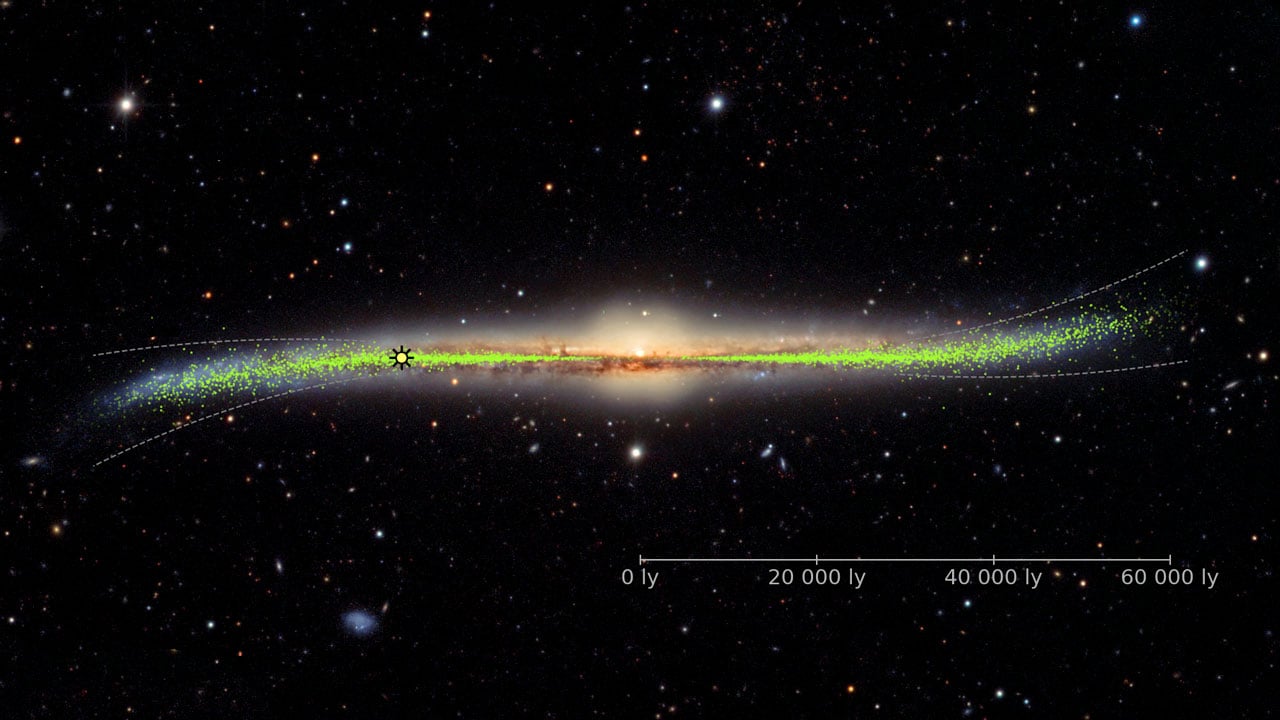 Először egy rövid áttekintés: a Tejút egy spirálgalaxis, amelynek körülbelül 120 ezer fényév az átmérője, és amelyben a csillagok, a gáz és a por széles korongszerű képződményben terülnek szét. Ez a korong mindössze néhány ezer fényév vastag, így ilyen szempontból valóban laposnak tekinthető. Közepén egy csillagokból álló központi dudor található, és az egészet körülbelül egymillió fényév átmérőjű, hatalmas, csillagokból és sötét anyagból álló haló veszi körül. Ez az utolsó részlet különösen fontos témánk szempontjából.