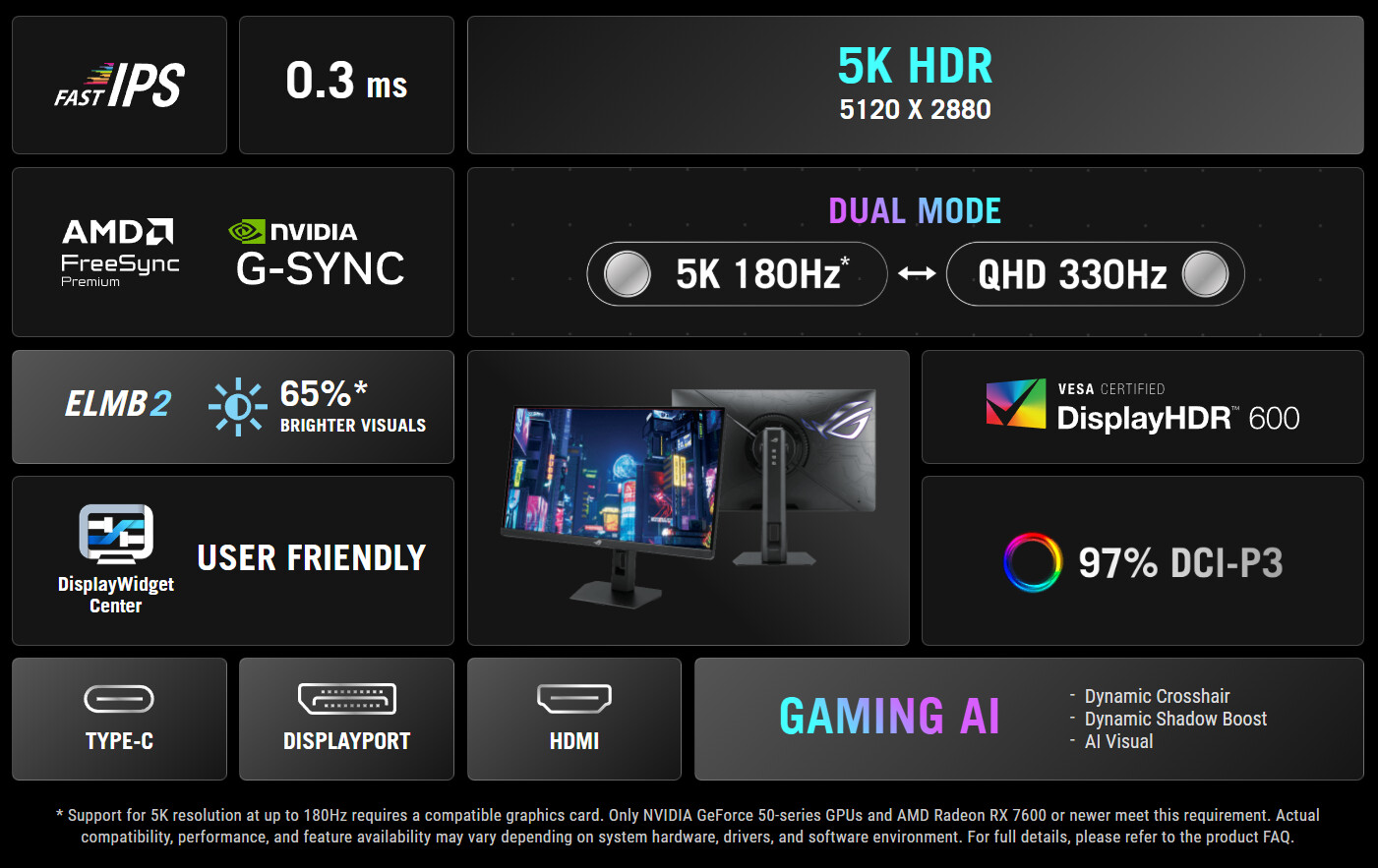 Alapok terén egy Fast IPS panellel szerelt megoldással van dolgunk, ami 5K-s és 1440P-s felbontással képes üzemelni, hála a Dual-Mode funkciónak. Az 5120 x 2880 pixeles natív felbontás mellé 180 Hz-es képfrissítési ráta kapcsolódik, míg a 2560 x 1440 pixeles üzemmód esetén 330 Hz-ig merészkedhet el a termék. Jelen van a kínálatban az ASUS ELMB 2 technológiája is, valamint kapunk ELMB Sync funkciót is, így a gyors mozgásból adódó elmosódások mértéke hatékonyan csökkenthető. Az új monitor kapott még AMD FreeSync Premium Pro és Nvidia G-Sync Compatible támogatást is, azaz a dinamikusan váltakozó képfrissítési rátából eredő előnyöket is élvezhetik a gamerek. Az újdonság SDR módban 350 nit, míg HDR módban 600 nit fényerősség elérésére képes, a 10-bites panel tipikus kontrasztaránya pedig 1500:1 értéket képvisel.