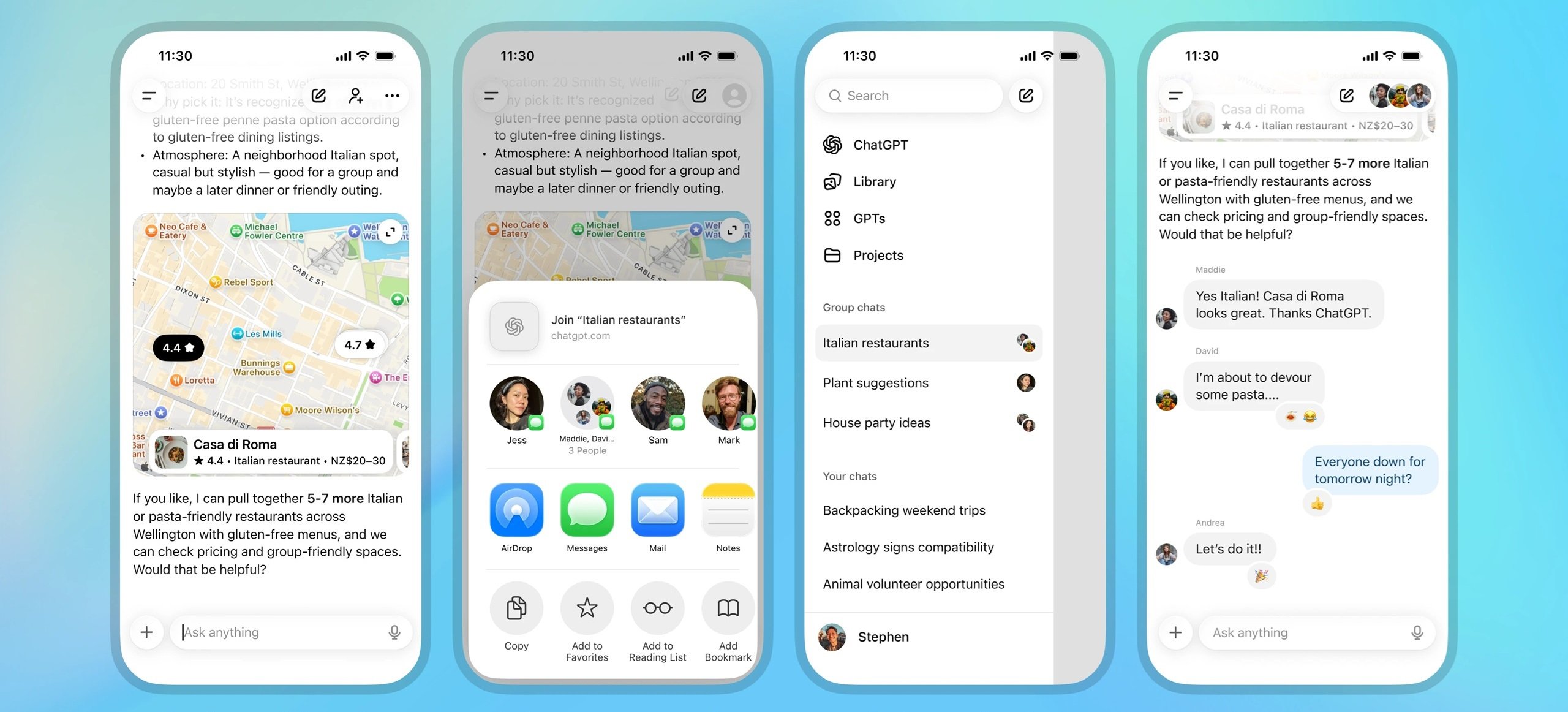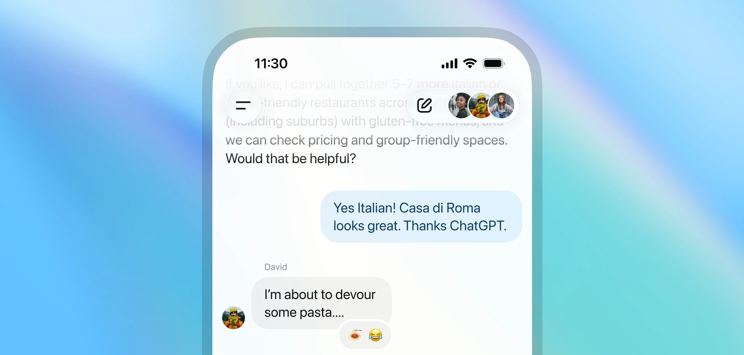 A csoportos beszélgetések bevezetése a szimpla üzenetküldőkben is fontos mérföldkő szokott lenni, az pedig ebben az esetben egy nagy csavar a történetben, hogy a mesterséges intelligenciával lehet majd együtt társalogni. Barátok, munkatársak, rokonok együtt vehetnek majd részt a ChatGPT-vel történő eszmecserében. Az újonnan indított beszélgetésekbe egyszerűen meg kell majd hívni azokat, akiket a felhasználó szeretne bevenni a csoportba. A meghívás közvetlen hivatkozással is megoldható.