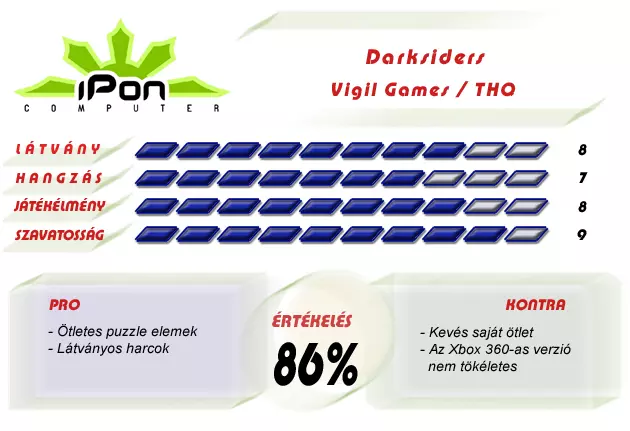Az imént említett Xbox-os bakit leszámítva nehéz komoly hibát találni a Darksidersben, hacsak azt nem számítjuk, hogy kevés eredeti ötletet lehet felfedezni benne. A játékidőre nem lehet panaszunk, mert bár multi nincs a programban (nem is hiányzik), de ha a trófeákat és a pályákon összegyűjthető tárgyakat is mind be akarjuk szerezni, akkor akár 20-23 órát is eltölthetünk a képernyő előtt. A különféle játékelemeket kiváló módon gyúrták egybe a fejlesztők, így végül egy nagyon szórakoztató program került ki a Vigil Games kezei közül.