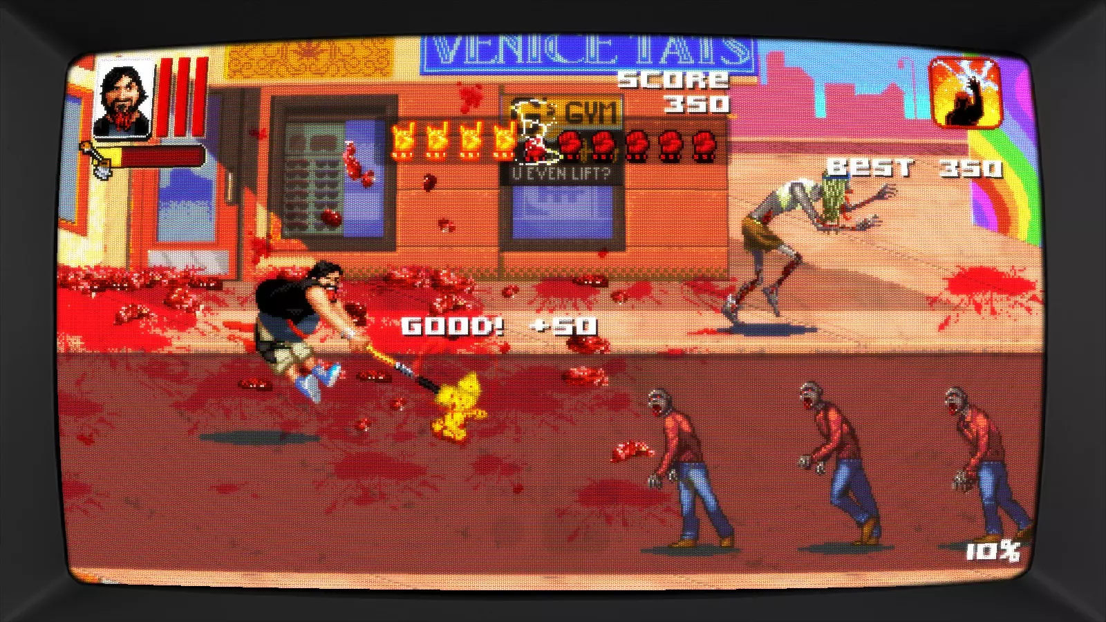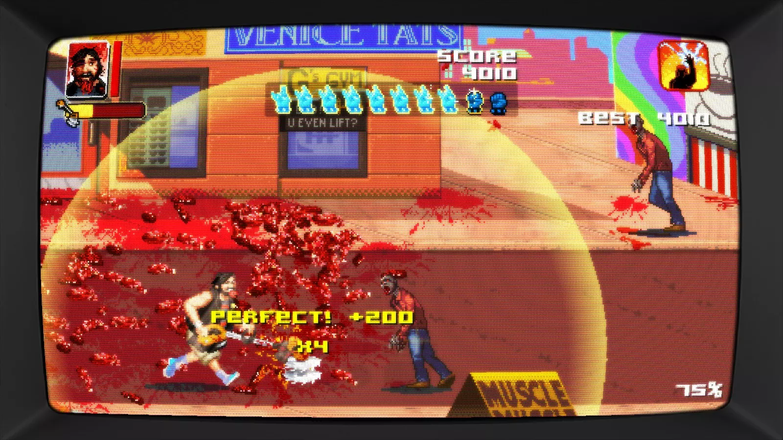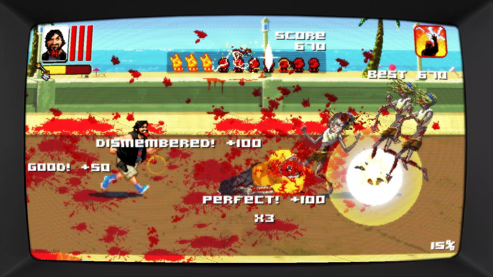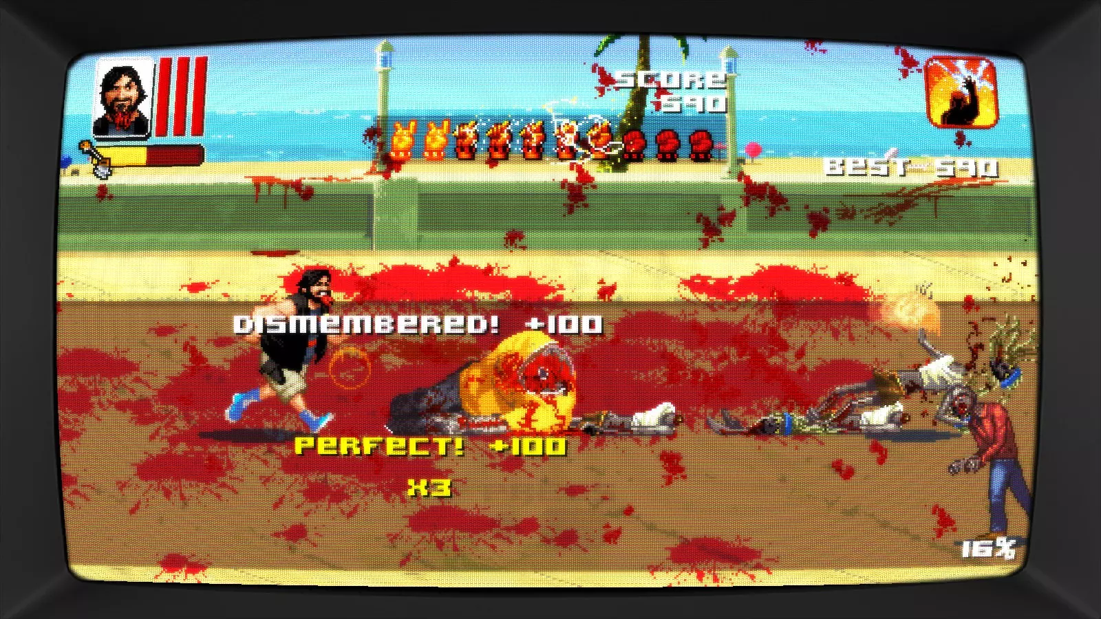 Mindez nem hangzik túl bonyolultan, de ennek ellenére nem száguldhatunk végig ész nélkül vagdalkozva a pályákon, mivel a szemből ránk rontó, vagy épp hátulról támadó rohadó rémségek és fegyveresek többsége egyedi taktikát igényel. Persze, van akit úgy üthetünk-vághatunk, ahogy kedvünk tartja, de olyanok is akadnak, akiket ha nem a megfelelő módon csépelünk, rögtön elvesztünk egyet a három életcsíkunkból, amiknek az elfogyása esetén kezdhetjük előröl az adott pályát. Egyeseknek felrobbannak, ha hozzájuk érünk, másoknál pedig figyelembe kell vennünk, hogy a testük rohad és tele van lyukakkal, így ha törzstájékon csapjuk meg őket, akkor amíg kihúzzuk a kezünk vagy a lábunk, belénk mélyesztik a fogukat. Mindez meglepően komplexé teszi az elsőre primitívnek tűnő programot, mert ha nem csak azzal foglalkozunk, hogy eljussunk a pálya elejéről a végére, hanem a pontszámunk is érdekel minket, akkor meg kell tanulnunk a saját javunkra fordítani a horda tagjainak gyengeségeit.
