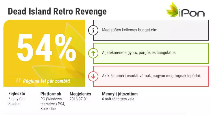 Összességében, a Dead Island Retro Revenge egy meglepően kellemes, olcsó cím, de semmi több. Azt viszont nem lehet elvitatni tőle, hogy ameddig el nem laposodik, addig adrenalinpumpáló élményben van részünk. Ha tehát szeretjük a beat 'em upokat, akkor rövidsége ellenére kötelező vétel, ha viszont a játéktermek hőskorában hódító műfaj nem tartozik a kedvenceink közé, akkor nem túl valószínű, hogy pont az Empty Clip Studios alkotása hozza majd meg a kedvünket ahhoz, hogy alaposabban elmélyedjünk benne.