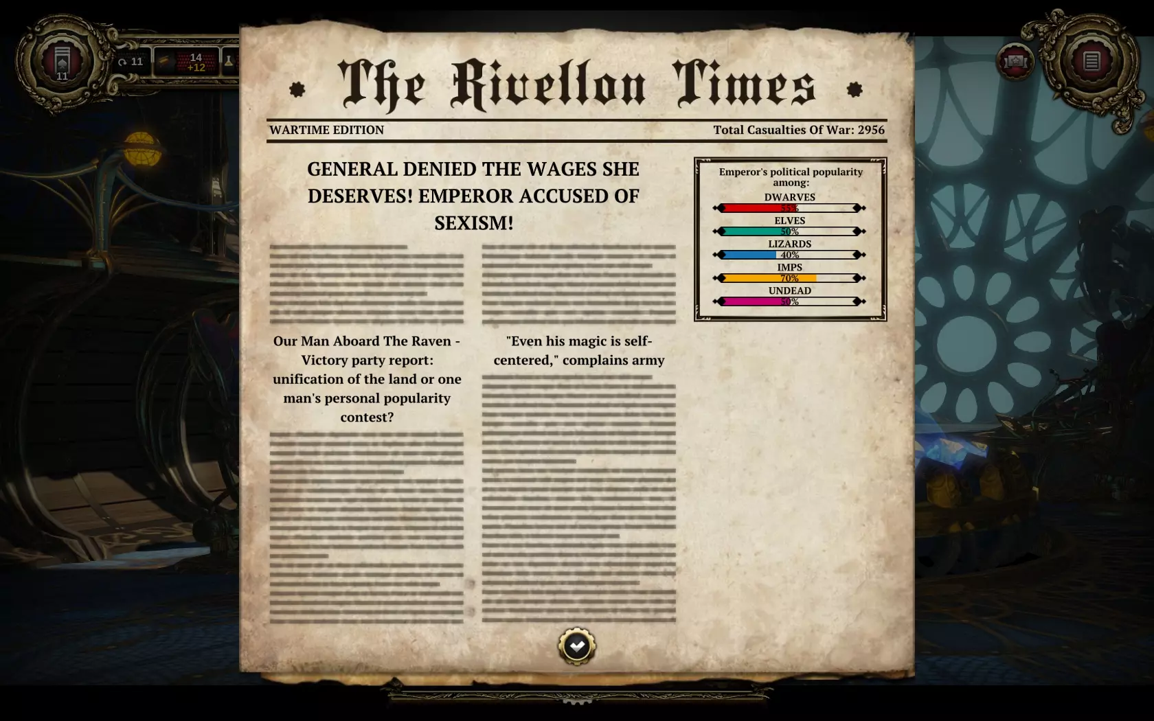Mivel a Larian alkotása többféle műfajt is elegyít, játékmenete is több rétegből áll. Az első, amit látni fogunk, hogy a léghajónk fedélzetén több mint egy tucat NPC verődött össze, akik bizony igénylik, hogy foglalkozzunk velük. Köztük van a már említett mágus, Maxos, több hadvezér, egy imp gépész, fél tucat politikai figura, akik a népüket képviselik és még sokan mások. A játék során lehetőségünk van mindegyikükkel beszélgetésbe elegyedni, és akár egy kaland- vagy szerepjátékban, különféle témákról csevegni. Időnként ők keresnek meg bennünket, ha van valamilyen kérésük, de bizonyos időközönként ajánlott a játékosnak is érdeklődni náluk, hátha van némi mondandójuk. A remekül megírt karaktereknek hála ez egyáltalán nem nyűg, sőt, a program egyik csúcspontja a velük történő foglalatoskodás. A Larian csapatának korábbi játékaiban is érezhető, hogy a lányok és fiúk nagyon értenek a humoros, egyedi dialógusok, illetve karakterek kidolgozásához, ám itt ez még inkább tetten érhető. Itt van például a felsőbbrendűségi komplexussal küzdő gyík, Edmund, a nőuralom élharcosa, Catherine, vagy épp a marcona, félig gép félig ember Henry. És akkor az élőholtakról nem is beszéltünk, akik itt végre nem a kezdő kalandozók gyakorló ellenfeleinek szerepét töltik be, hanem értelmes, vallásos figurák, akikkel öröm eldiskurálni. De nem csak azért vannak itt ezek a szereplők, hogy a magunk szórakoztatására piszkáljuk őket, a történet bizonyos pontjain (meglehetősen gyakran) döntéseket is kell hoznunk, melyek befolyásolják a birodalmunk helyzetét, és ezeket bizony meg kell vitatnunk ezekkel a karakterekkel. Ezeknél a fordulópontoknál nagyon érezhető, hogy a Larian egy kis politikai szatírát is bele akart vinni a játékban, hiszen olyan dolgokban kell állást foglalnunk, mint a melegek házassága, az ingyenes egészségügy, vagy épp a legális droghasználat. Ez bizonyára nagyon ijesztően hangzik, hiszen eléggé idegen témáknak számítanak egy videójátékban, de mindenkit biztosíthatunk, nagyon humorosan illesztették be a fejlesztők a játékba ezeket a kérdéseket.