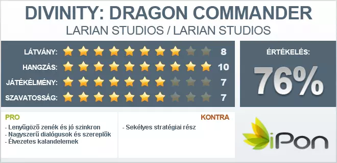 Mindezek fényében nehéz dolog értékelni a Divinity: Dragon Commandert. A játék magját alkotó stratégiai rész meglehetősen átlagos lett, ezt kár is lenne tagadni, nála sokkal jobb RTS-eket is találni a piacon. Ha tehát csak ezt a részét vennénk figyelembe ennek a hibridnek, akkor nem adhatnánk rá közepesnél jobb értékelést, ám egyszerűen nem lehet elmenni szó nélkül a kiváló kalandjáték elemek, a karakterekkel történő érdekes interakció, a lenyűgöző zene és a stílusos megvalósítás mellett. Ha elfásultunk egy-egy unalmasabb csata után, a léghajónkon folytatott beszélgetések és a ránk bízott döntések rögtön visszahozták a kedvünket a játékhoz. Már csak ezek miatt megéri a végére érni a sztori módnak. Nagyon reméljük, hogy lesz folytatása a Larian e munkájának, hiszen ha sikerül kijavítani a hiányosságokat, akkor egy igazán jó programot fogunk kézhez kapni.