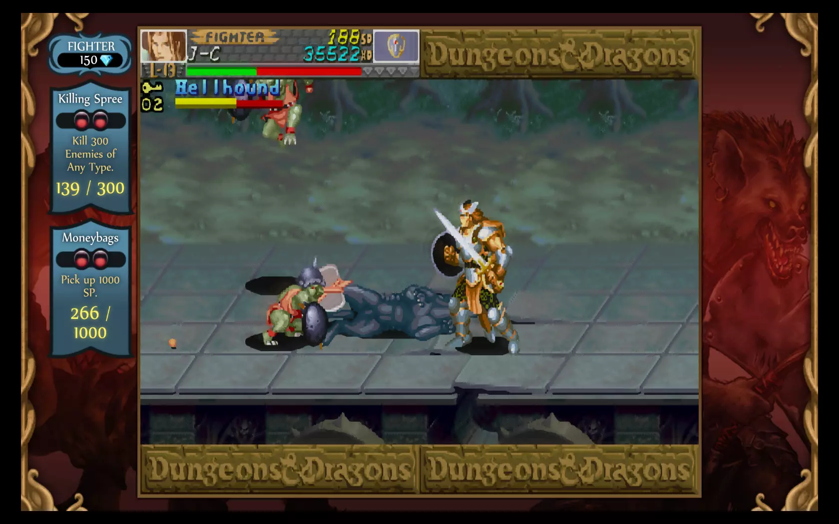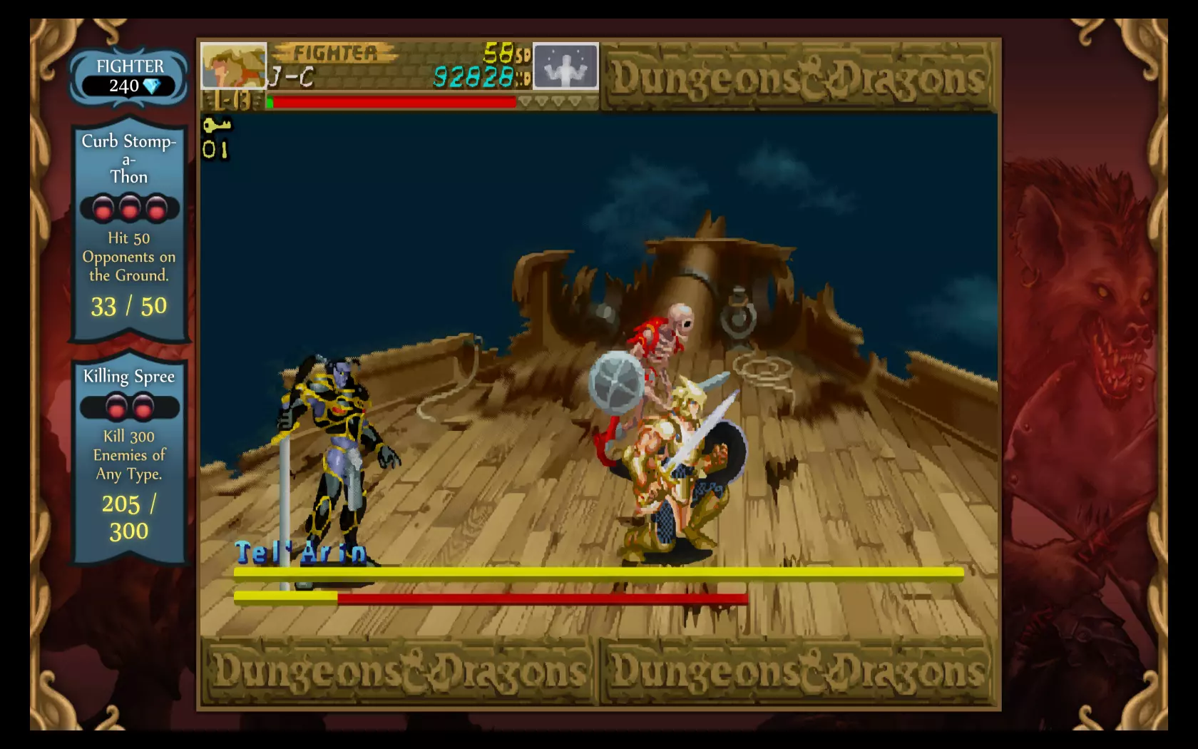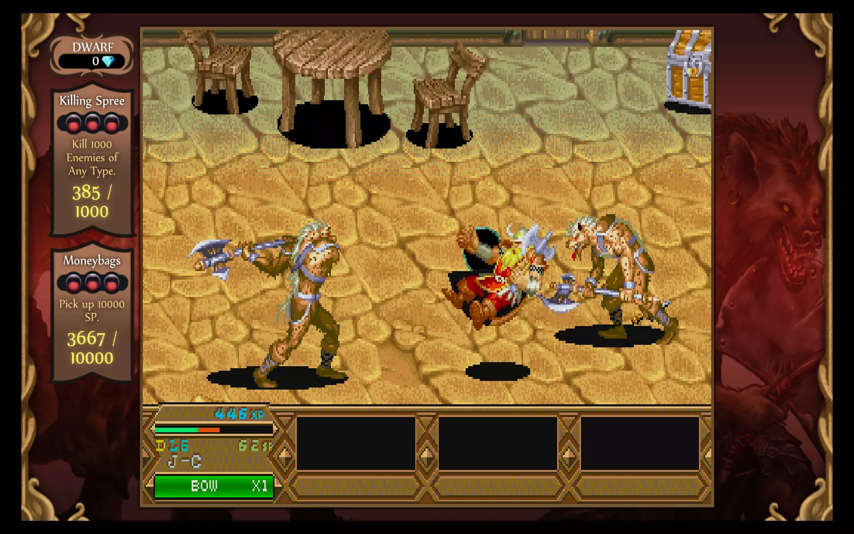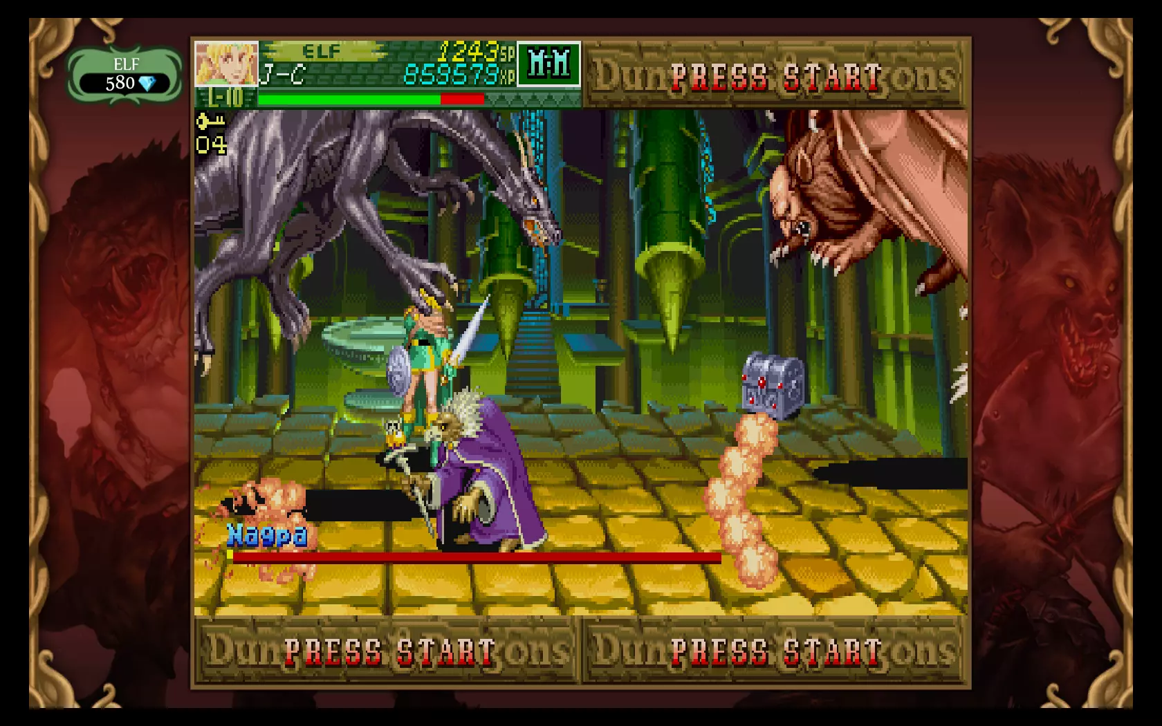 Tower of DoomA kicsivel több, mint négyezer forintért beszerezhető Chronicles of Mystara csomag tartalmazza mindkét, az imént említett Capcom alkotást, melyek között a főmenüben egy gombnyomással lehet váltani. Tartva magunkat az eredeti megjelenési dátumokhoz, elsőként a Tower of Doomba vetettük bele magunkat, amely egy kilenc pályából álló sztorimódot kínál számunkra. Történet terén nem érdemes sokra számítani, az arcade játékok sosem a kifinomult cselekményről voltak híresek, és ezen az új verzióban sem változtattak a fejlesztők. Egyszerű világmegmentős sztoriról van szó, és bár van néhány párbeszéd a játékban, azok nagyon sablonosra sikerültek. Koncentráljunk inkább a játékmenetre, amit akár egyedül, akár egy négyfős kooperatív mód keretében is kipróbálhatunk. A Tower of Doomban négy karaktertípus közül választhatunk (harcos, törp, elf, pap), melyek mindegyike más-más képességekkel rendelkezik. Nem csak az eltérő életerőre és a támadási formákra kell itt gondolni, hanem a használható fegyverekre és varázslatokra is, melyek miatt minden karakterhez egyedi játékstílus tartozik. Azt azért meg kell jegyezni, hogy a harcos és a törp kicsit elhanyagolt kasztoknak számítanak ebből a szempontból, hiszen ők csak a fegyvereiket (kard, balta, dobótőr és kalapács) használhatják, míg az elf és a pap ezek mellett különféle varázslatok közül is válogathatnak. Ettől függetlenül ez a változatosság meglehetősen egyedi volt a játék első megjelenése idején, és még ma is elég jól működik. Az alap fegyvereket leszámítva minden képesség fogyóeszköznek számít a harc során, de szerencsénkre a legyőzött ellenfelekből mindig csurran-cseppen valamilyen loot, amiből feltölthetjük a készleteinket, legyen az varázstekercs, fegyver, vagy a falvak boltjaiban vásárlásra használható ezüstpénz.