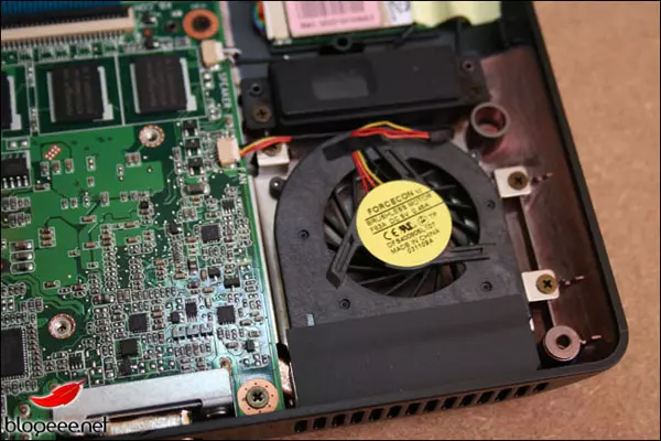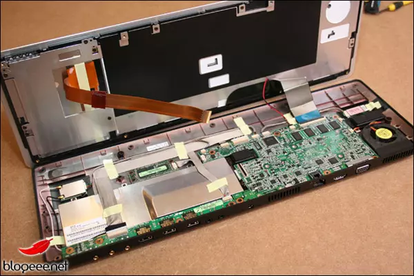 A szétszedés folyamata rendkívül jól dokumentálva van, mi csak a fontosabb képeket emeljük át, a többi itt található. A készülék egyáltalán nem meglepő módon laptop-szerű felépítéssel bír. A tesztelők szerint a termék 1800 mAh-ás akkumulátorral érkezik, amely nagyjából 1,7 órán át képes üzemeltetni a rendszert egyetlen feltöltéssel. A rendszerben 1 GB-nyi DDR2-es rendszermemória lapul, amely az alaplapra van forrasztva, ezen kívül egy sztereó hangszórópár is megbújik a házban. A rendszer hűtéséről egy heat pipe alapú megoldás gondoskodik, amelyen egy 40 mm-es átmérőjű ventilátor foglal helyet. Az információk szerint a ventilátor 24 dB-es zajszint mellett működik, emellett megfelelő mennyiségű levegőt is képes megmozgatni, mindezt pedig a tesztelők szerint valóban elfogadható zajszinten teszi. A pici ventilátor bőven elég lehet a rendszer hűtésére, a komplett konfiguráció egyébként mindössze 25W-ot fogyaszt.