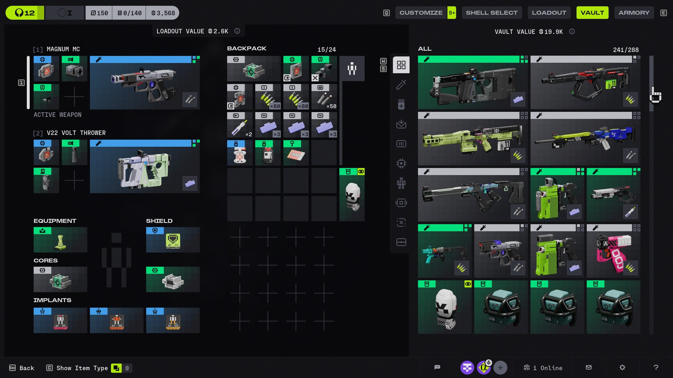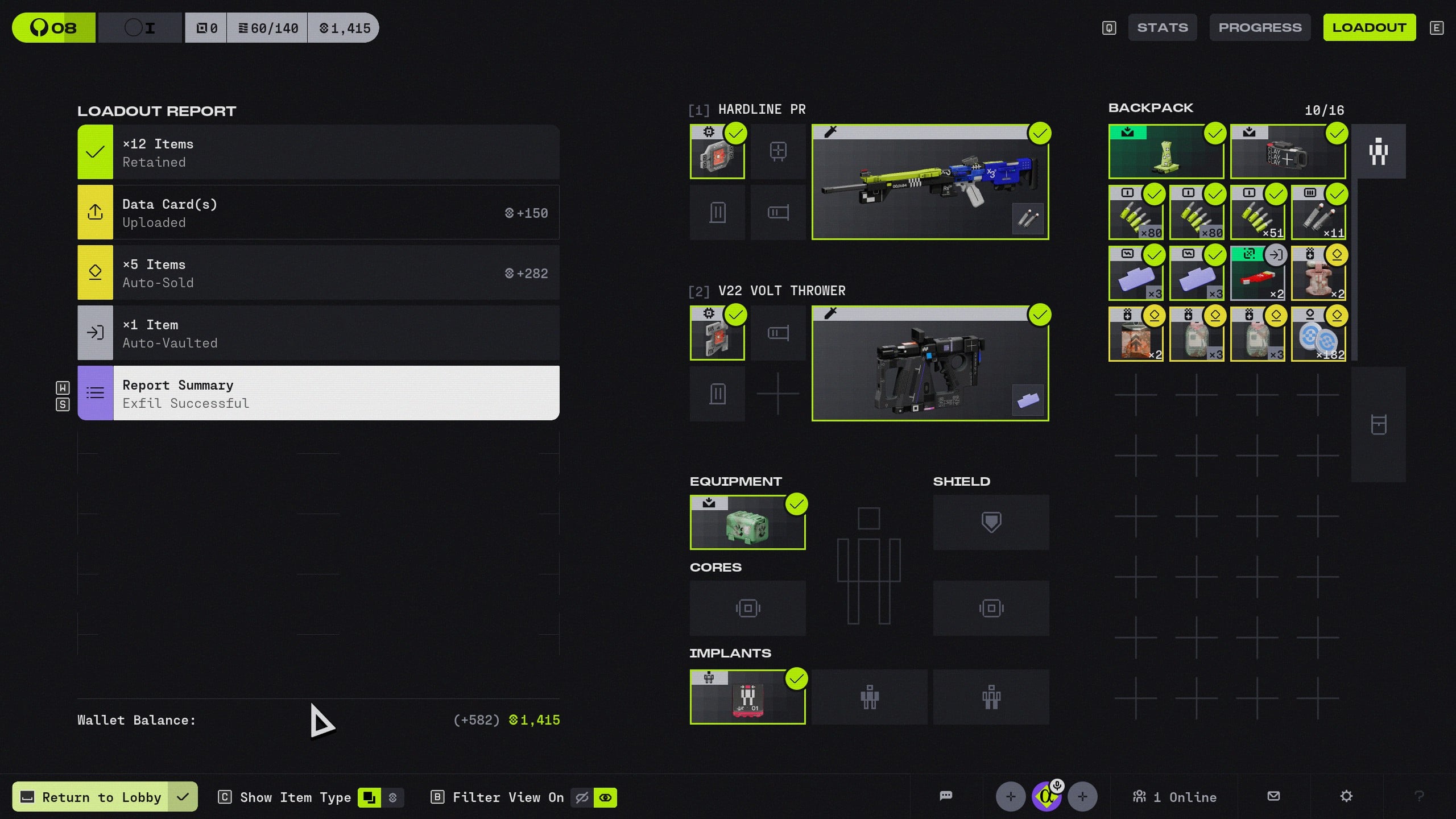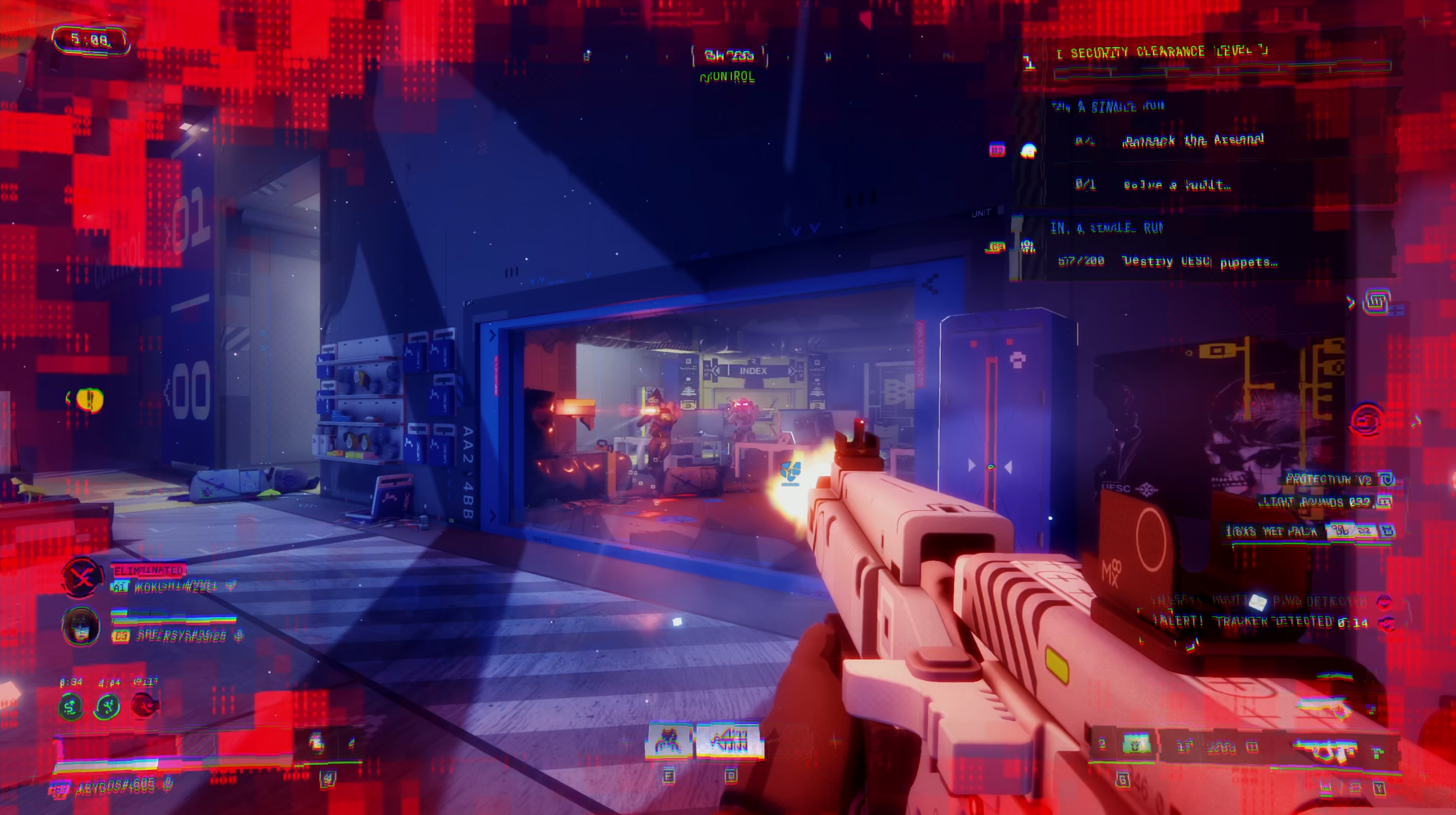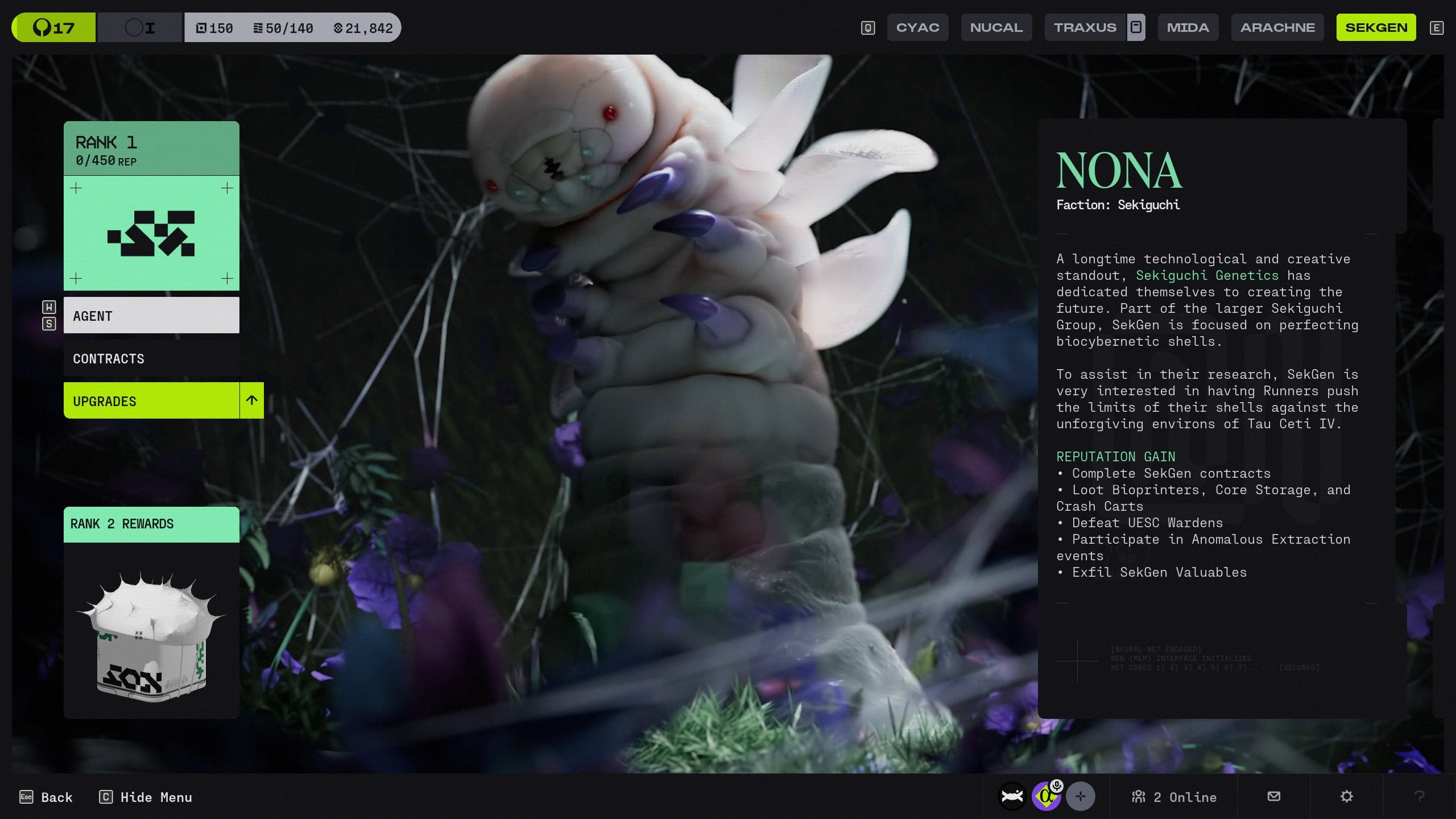Szóval a menü nyújtotta metagame több részre osztható. Először is ott vannak, a küldetések, amiket tetszés szerint választhatunk ki. Ezek a küldetések plusz felszerelést vagy erősítést biztosítanak a shellünknek, ami azt jelenti, hogy minél jobb barátságban vagyunk egy adott vállalattal, annál erősebbek lehetünk a harctéren. A jobb felszerelés itt jobb fegyvereket, pajzsokat, erősítő implantátumokat, nagyobb táskákat és hasonló bónusz dolgokat rejtenek, míg a passzív képességek fejlesztésével gyorsabbak, ellenállóbbak és masszívabbak lehetünk. A küldetések tetszés szerint kiválaszthatóak, rendszerint egy vállalat több küldetést is kínál számunkra. Még ha van is olyan, aki hiányolja, én magam nagyon örülök, hogy nincs bázisfejlesztés és más időhúzó opció. A fejlesztések könnyen elérhetőek a menüből, így nem kell rohangálni és menedzselni értelmetlenül egy bunkert. Így is van elég dolga az embernek, azzal, hogy nem kell a karakterrel ide-oda mászkálnia, jóval hamarabb indítható a következő run.